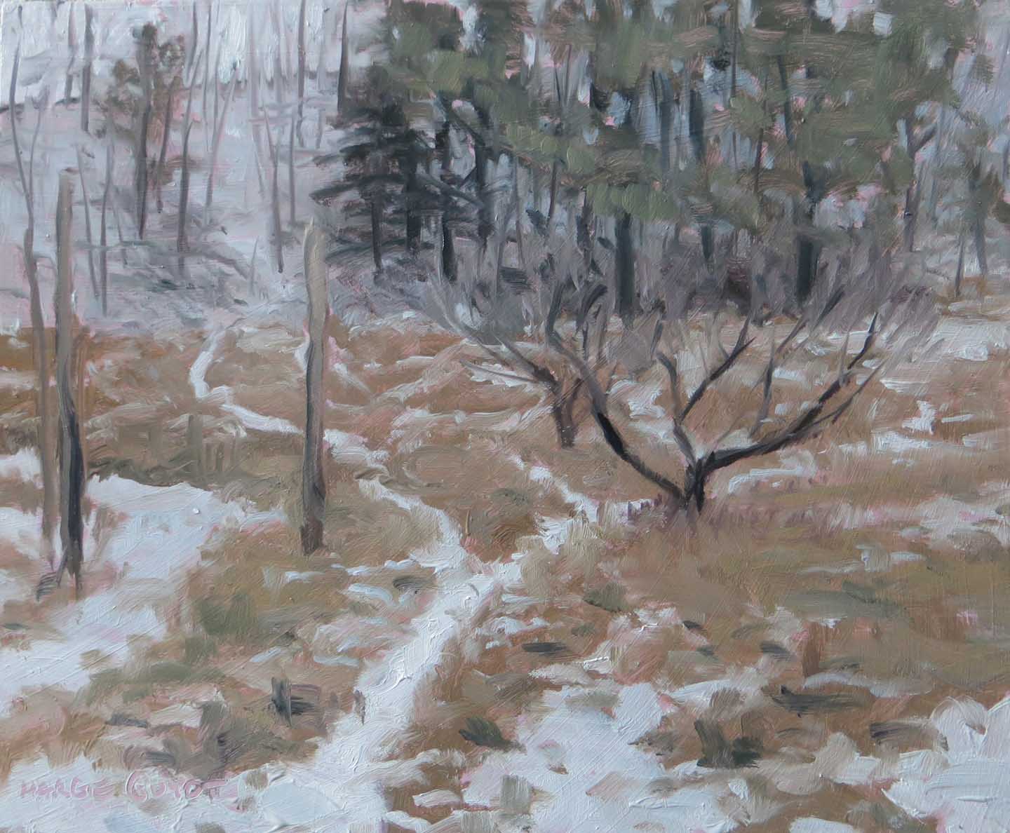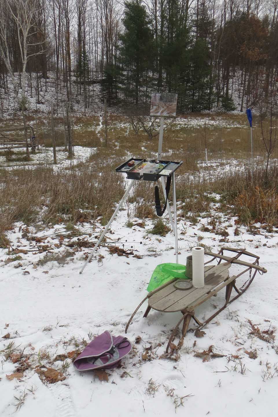 The good thing about winter is getting to see all the deer paths! I’d been eyeing these for days. Without ever-changing weather, a blizzard could hit – or it could all melt — and good-bye, deer trails! Today I waded through the mess in the garage, plucked my sled off the wall and put it to good use: schlepping art supplies. My setup was about halfway down the driveway, looking east.