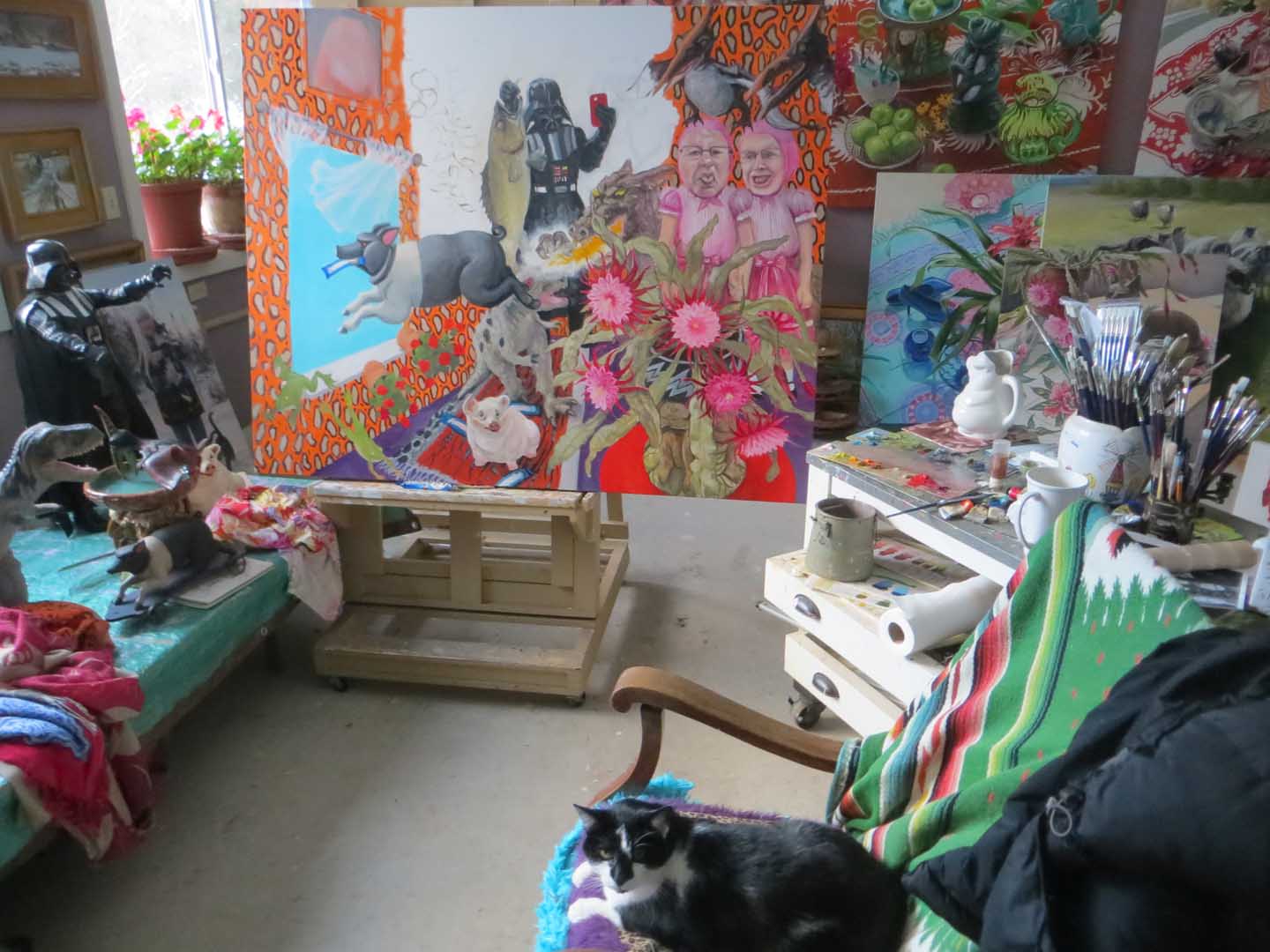 A wonderful day — I didn’t have to go anywhere! Just getting to stay in the studio and work – with my favorite cat – is bliss! Made a lot of headway today. I think I’ve figured out solutions for how to finish this. Stay tuned!
