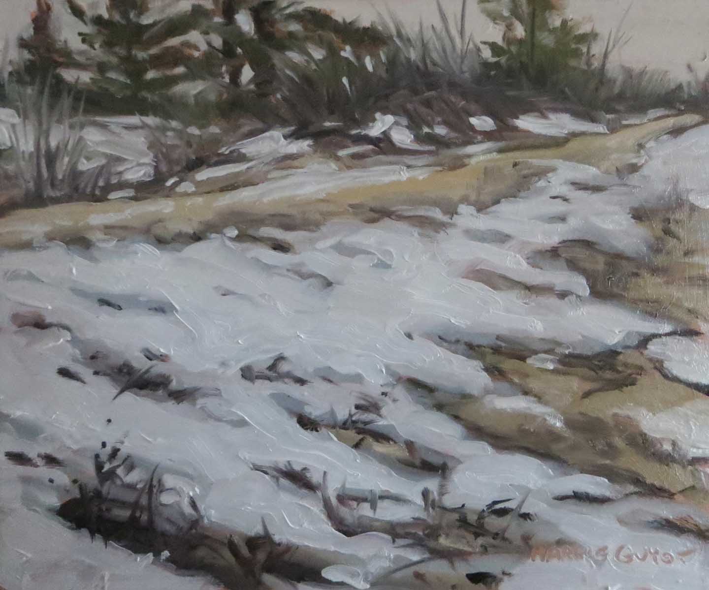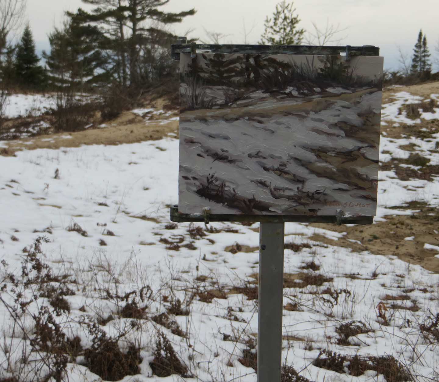 The trail kept going and going, deeper into the woods. I couldn’t even hear the lake anymore. My gear was getting heavy. I decided to turn around and head back. Maybe paint down at the creek as originally planned. At one point I veered off the path and hiked over to check out the dunes. That’s where I did this painting. Sure, it’s not a Kinkade, but I liked the movement of the lines. I set up my easel in a big snarl of wild grape vines and dead brackens. In the summer it would have been an awful mess. Full of mosquitoes, gnats, black flies, ticks. Argh.