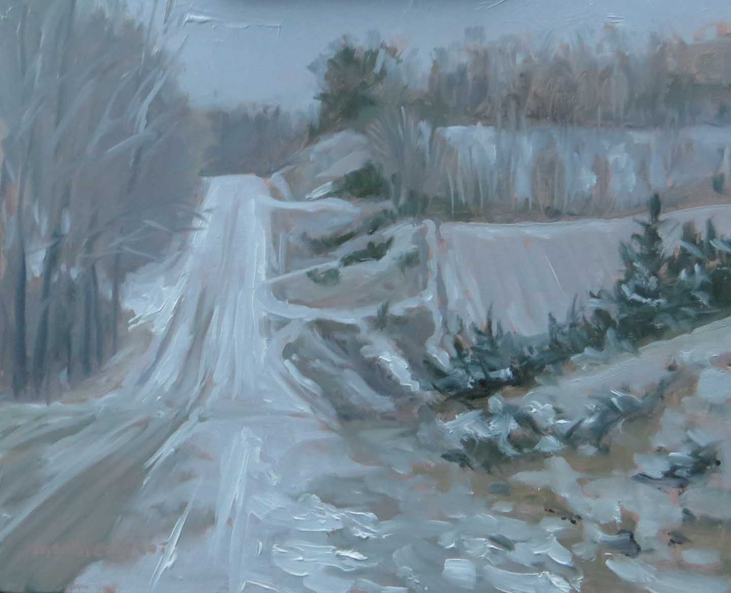 I quickly unloaded my paintings into the studio, threw my paints into the truck and returned to this spot. Propping my birch panel against the steering wheel, I painted as quickly as possible. Time – and darkness – won’t wait!