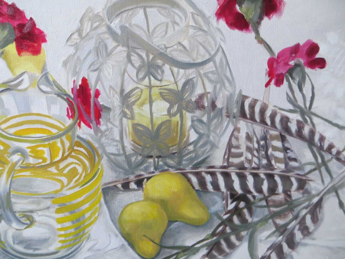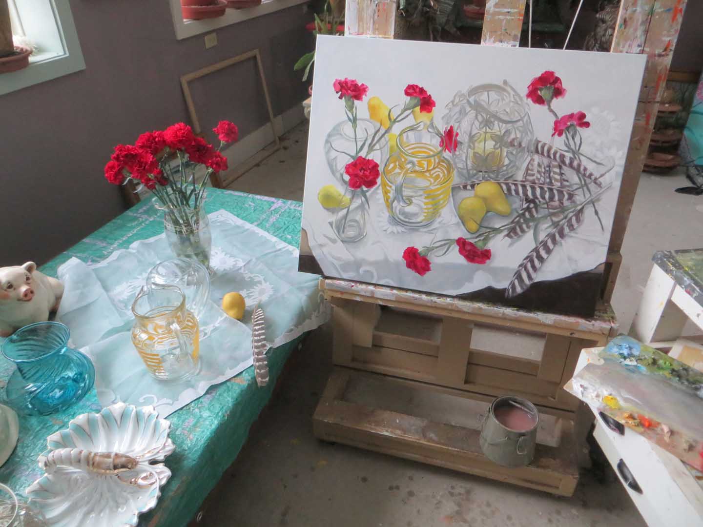 The storm clouds returned, errands were completed, housework done – and I’d run out of excuses to get back to my still life. Ripped the setup apart. Nailed the wild fabric to the wall in my new sauna room. And selected a nice, gentle background fabric. Everything on the setup is in disarray, but I think I can handle it. Started adding some red carnations. Began painting in the fabulous butterfly lantern. Ah….. there is hope!