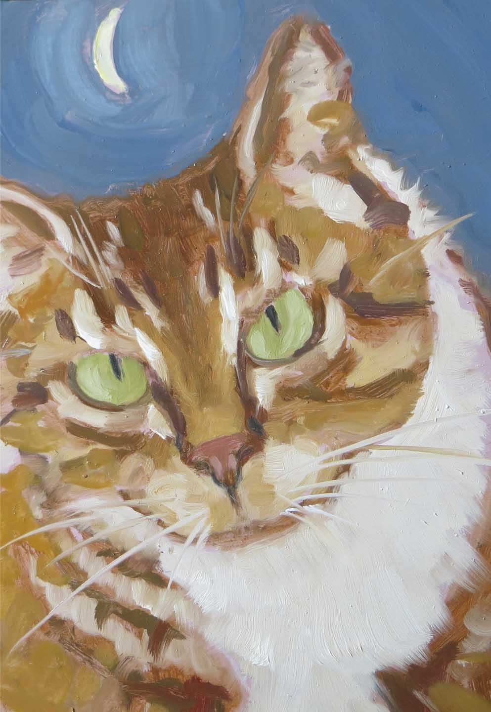 Just try getting a cat to hold still for a painting! I have to rely on photo references. This red tiger cat is an invention — it was done from a b&w photo of my gray tiger cat, Mr. Wonderful.