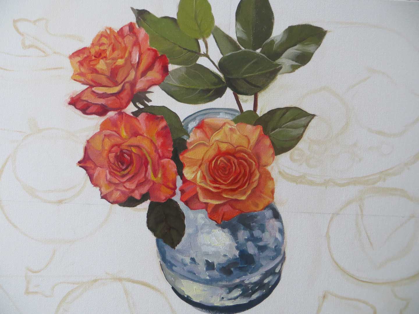 I don’t often paint roses. I love them, but tend to cringe at the thought of trying to paint all those petals! But now, in the dead of winter, there’s not much else to do, other than fight it out with the rose petals. Sure, floors always need washing, dishes always need doing, but — ugh! As I’ve said before, the key to making a successful painting is in learning how to control your panic!