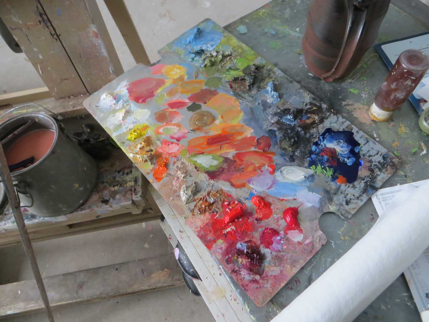 Here’s a peek at my palette this afternoon. It helps to have lots of different shades of red. Some colors just can’t be mixed. At the end of each session I scrape remnants into a communal pile and blend. That mix is used to tone my birch panels. I prefer soft shades — grays, violets, pale peach, pink. One of my artist friends tones his canvases with bright orange. I tried that once & nearly had a stroke trying to paint over it.