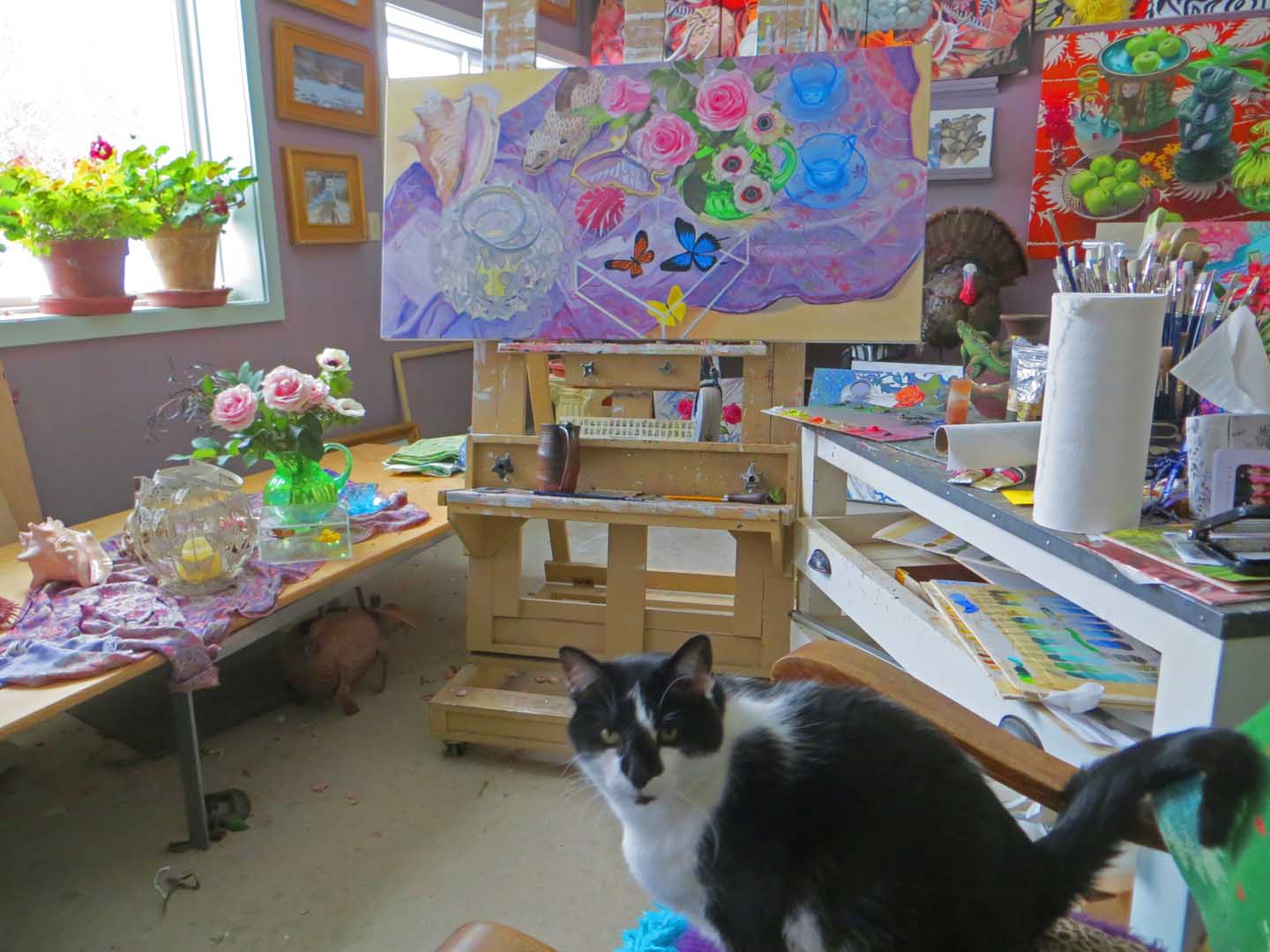 Continued to struggle with the butterfly candle-holder and butterfly box. Occasionally I’d take a break and focus on the tablecloth, which is kind of a nightmare in itself! It’s been sunny the past few days, which is nice, but sometimes it creates problems when it shines directly on (or through the backside) of the canvas. I have plenty of excuses, don’t I?