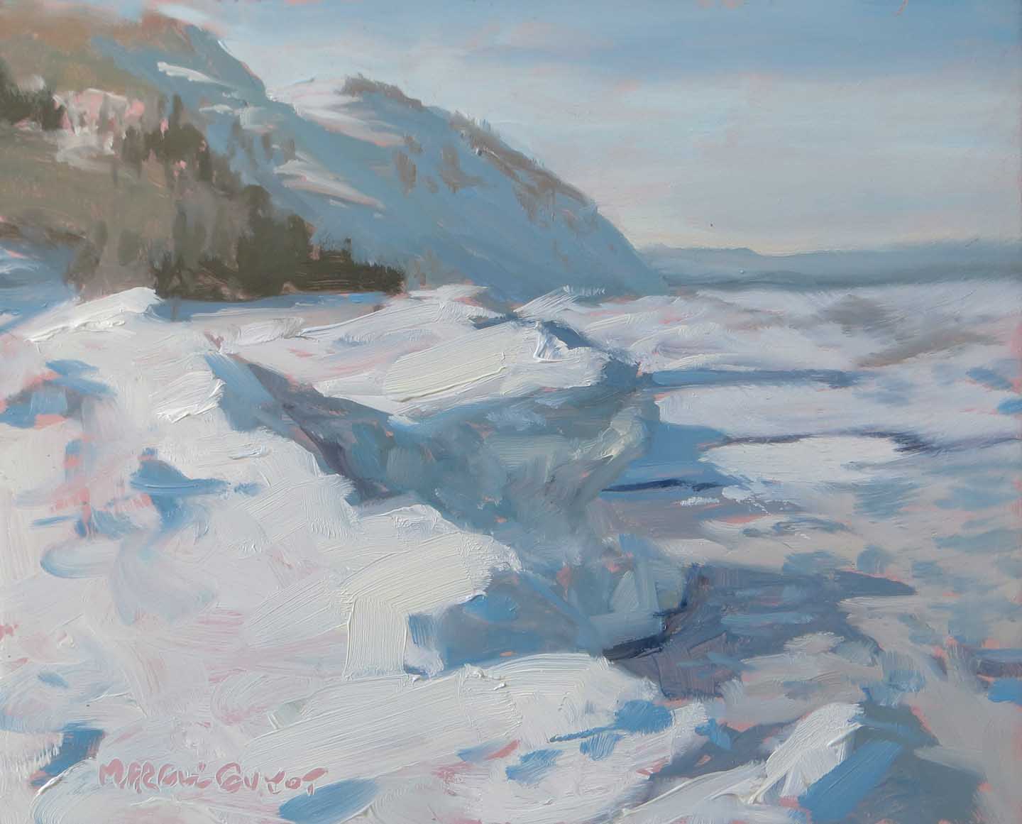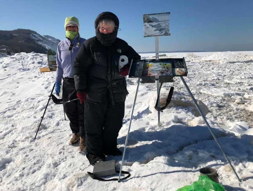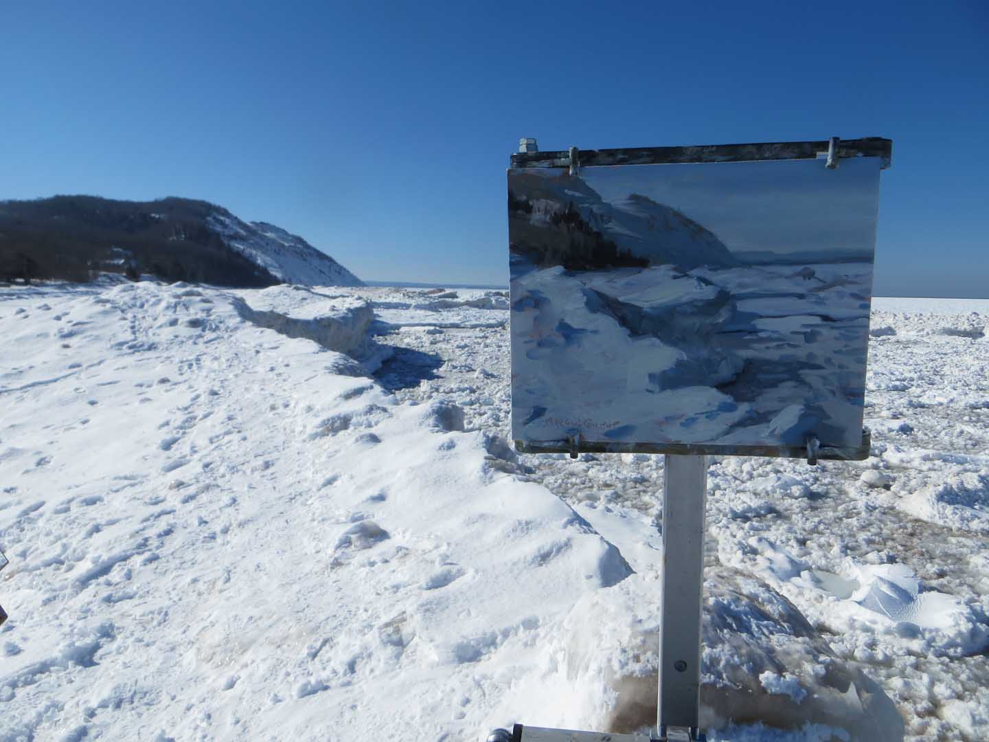 While sipping coffee in my jammies yesterday morning I saw a photo of an ice cave on Facebook. Hot damn! That’s it! I couldn’t stand another day of painting flowers in my studio! I called my friend Lori Feldpausch, another avid plein air painter. We carpooled over to Empire, just south of the famed Sleeping Bear Dunes.