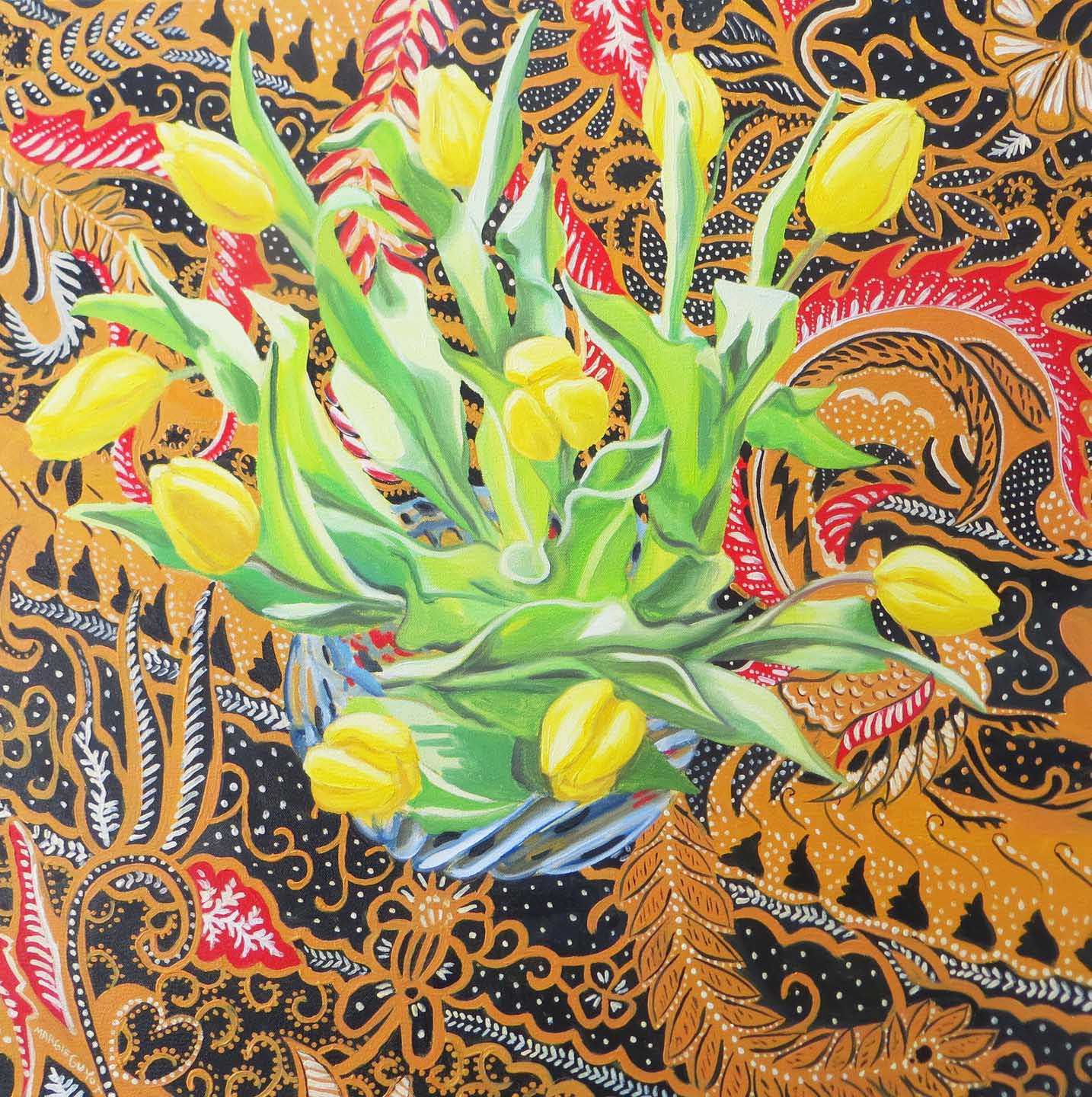 After spending about a day and a half, painting in squiggles and dots, I felt almost qualified to be a cake decorator! Heading to the store today — hmmmm — what color tulips next? Purple — or pink?