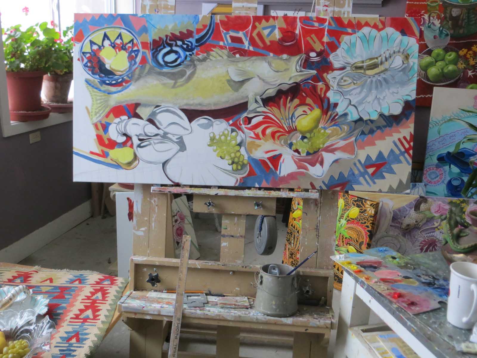 Then there was a robin who kept battering itself against my studio windows, trying to get in. Which excited Picasso, my cat, who jumped up onto my still life setup to watch the excitement. This painting is complicated enough without also having a Bird Apocalypse going on, so I closed up shop a little early today!