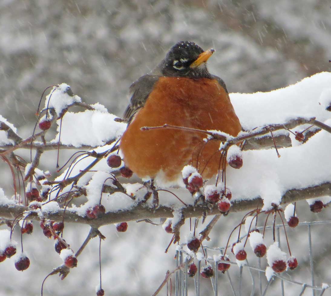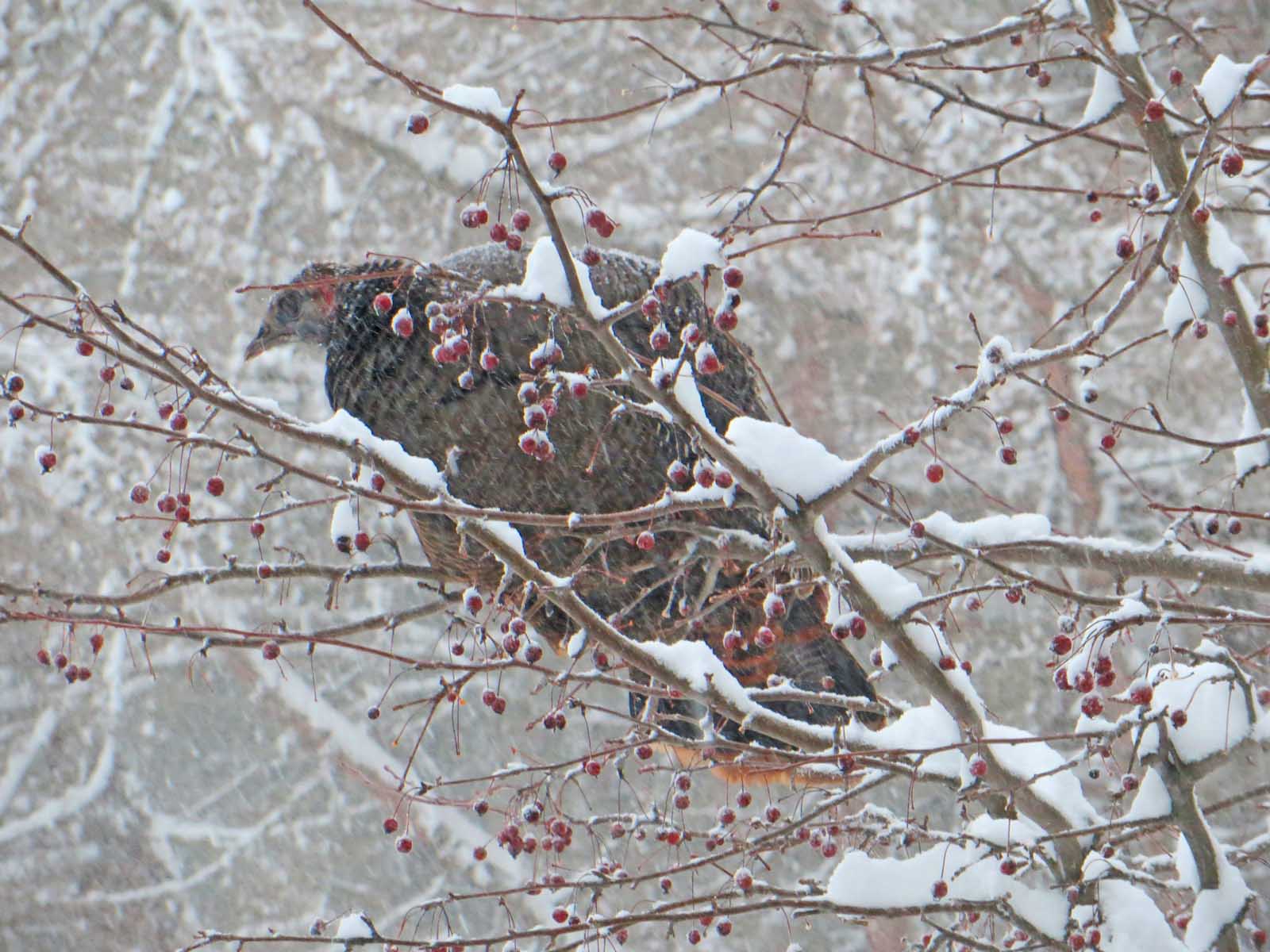 Here’s a close-up of an enterprising hen who’d flown up into the crab apple tree. She gobbled up some of last season’s crop of crab apples before skedaddling off to join her tribe. Isn’t that a sad face?