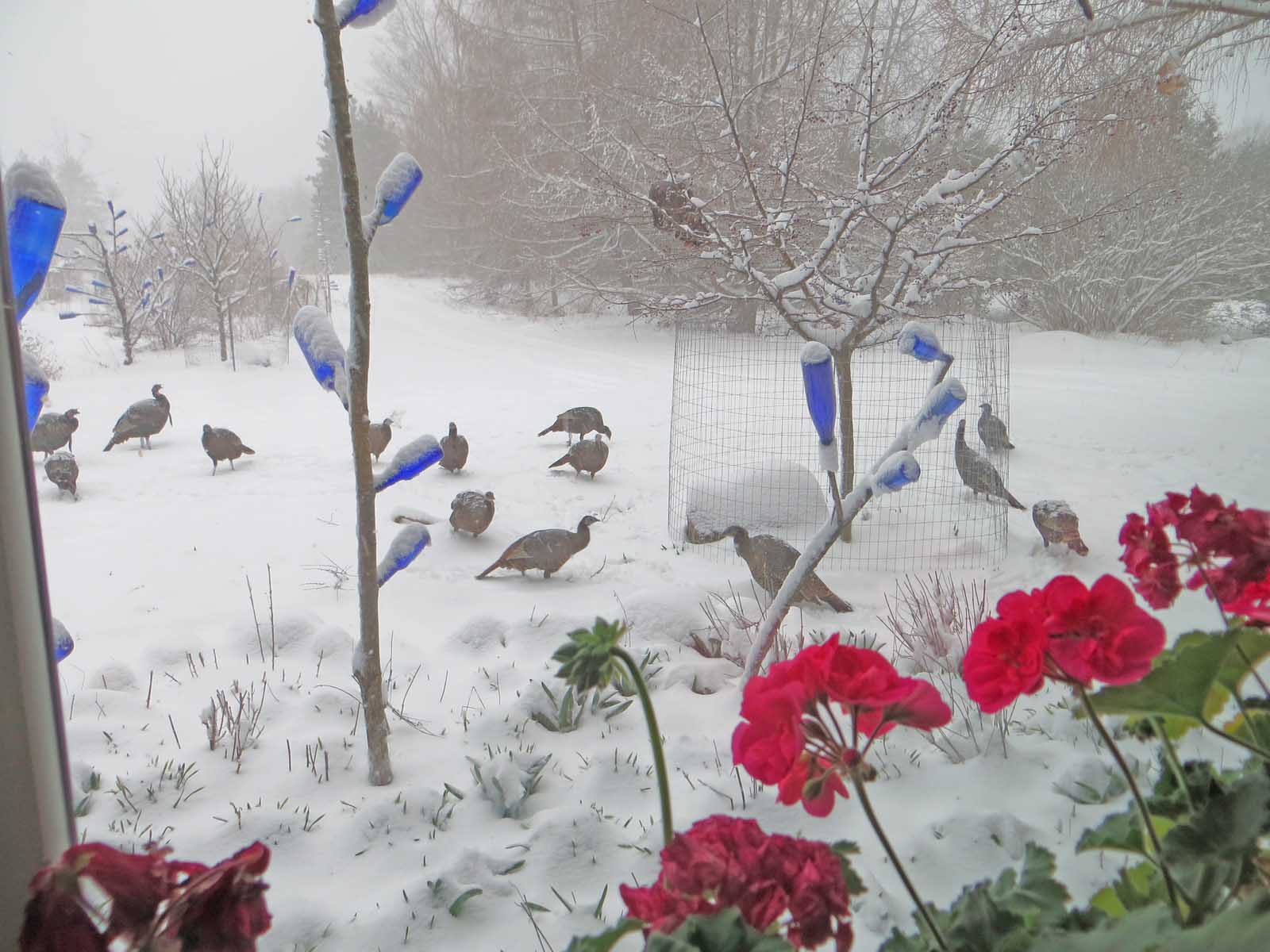 No sunshine today. A good, three to four inches of snow has fallen so far. So there were no strong sunlight/shadow patterns for me to work on. But I plugged away on what I could. I’d planned on working a lot longer today, but it was just too crazy outside. Two flocks of very miserable-looking, bedraggled turkeys came through my yard. I snapped a view of them through my studio window. Poor things.