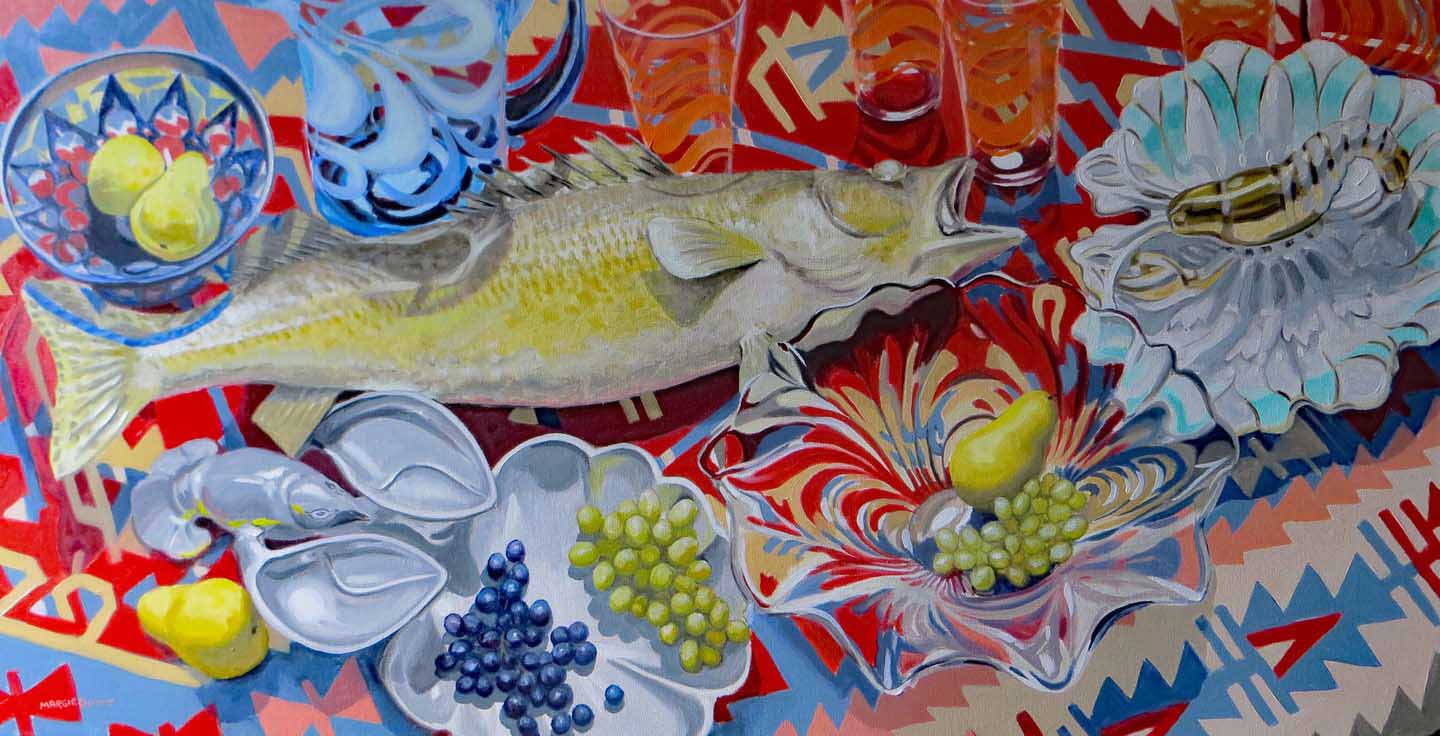 “Walleye with Lobster Bowls” — oil on canvas 24 x 48″ by Margie Guyot