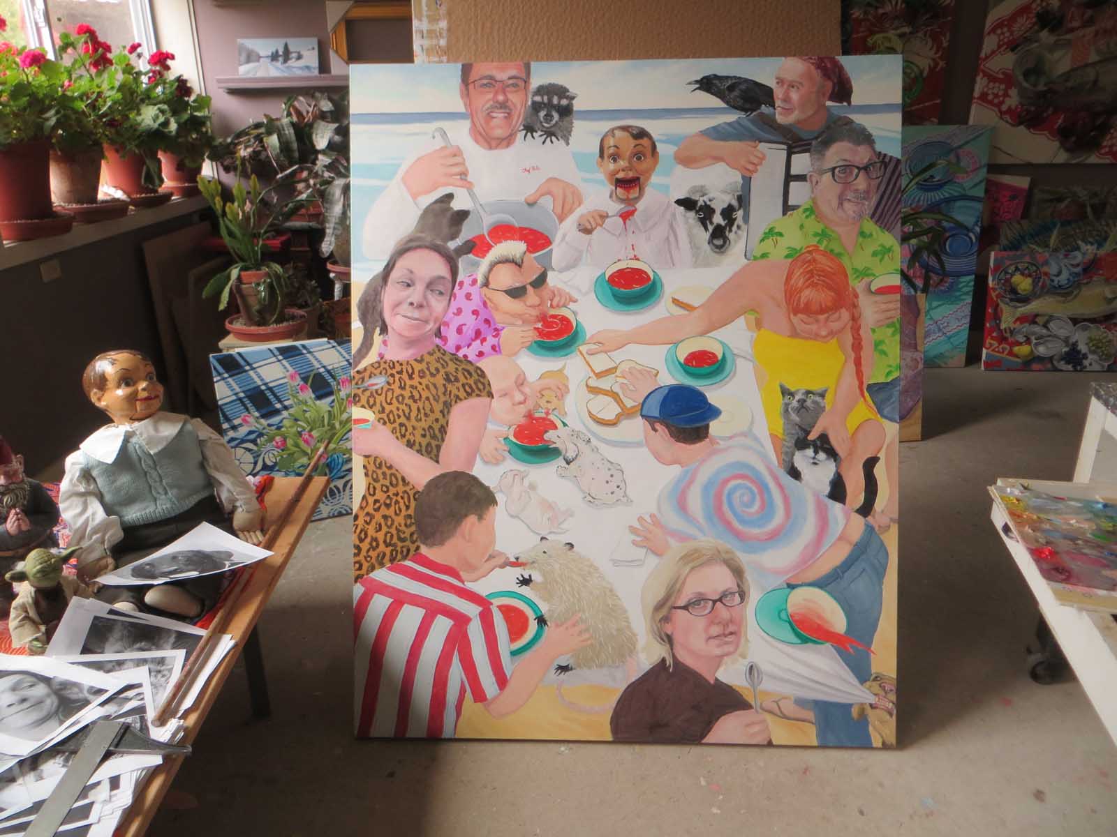 The end is near! Today I added the lake background. When it dies I’ll throw in some boats. Around here it’s kind of a joke: paintings with boats on the lake are sure to sell. There might be more creatures lurking under (or on) the table, so stay tuned….