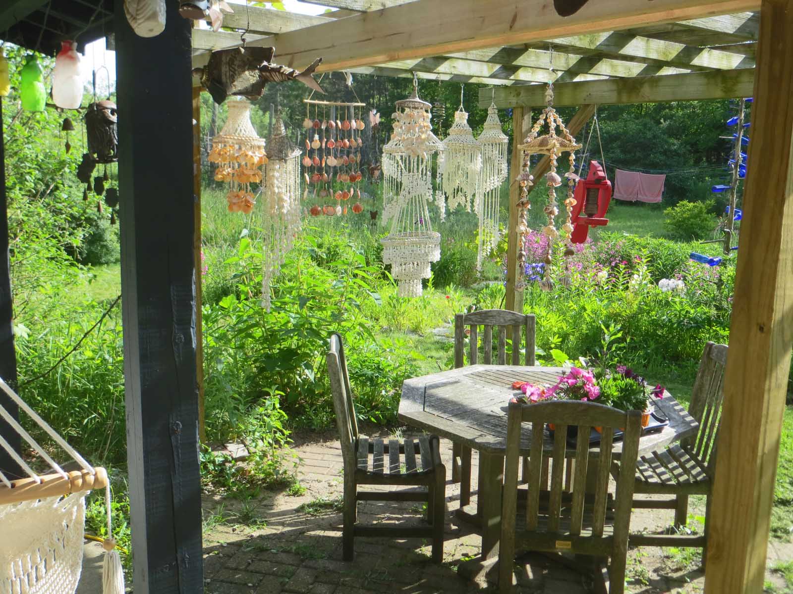 I’d spent much of the day ripping out an old, dead grape vine from my grape arbor. Snipping dead pieces, picking them all up, shoveling sunflower hulls, pulling weeds. Then I hung my collection of “shell things” to try to make things interesting.