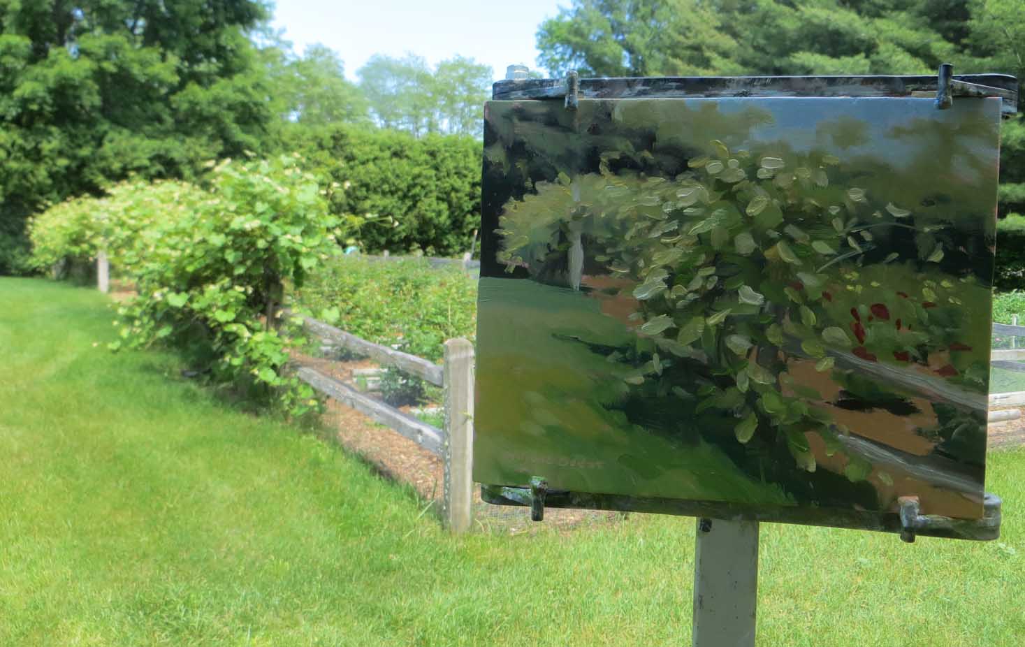 When your friend calls on a glorious June morning, asking if you’d like to go painting at a flower farm, you drop everything and GO! Not only was it “just” a flower farm — it was also designed to be a sort of secluded, magical, wedding venue, set out on the beautiful Leelanau Peninsula. There was a koi pond, rose gardens, snowball bushes galore and several funky antique outbuildings — with fairy lights. How could anybody go wrong? The owner treated us to a rather wild, bumpy ride on her ATV through the gardens, up the steep hillside, through the maple forest to see a glimpse of the lake. Paradise!