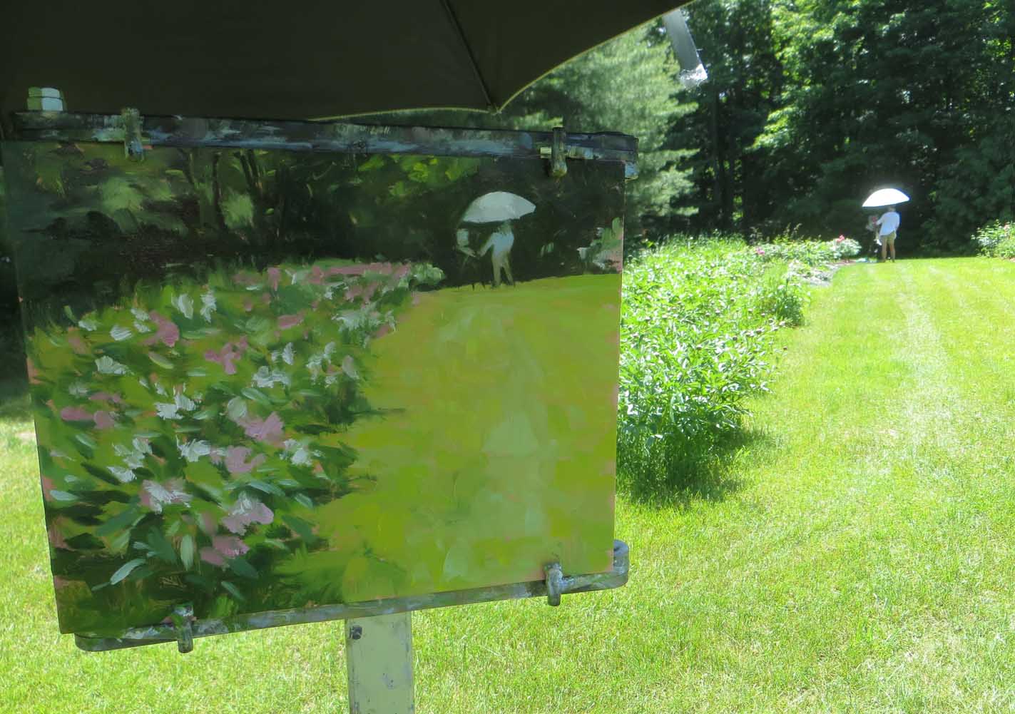 When we finally settled down to paint, we found it necessary to invent the blossoms on the peonies and roses. Winter hadn’t wanted to leave. Our summer weather had been delayed a couple weeks this year. Thank goodness we’d thought to bring our painting umbrellas along! The blazing sun and 83 degrees would have roasted our “northern bodies”. As I always tell people, anything over 75 is just too damned hot!