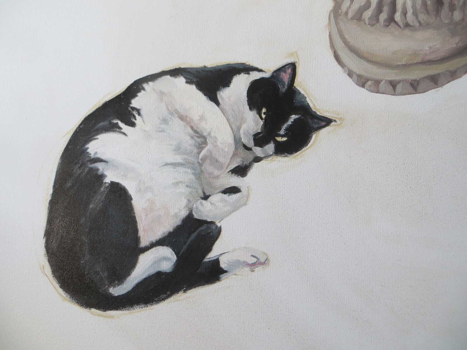 Ah, busy summer days! When it hit 87 degrees outside yesterday, I put down the garden hose and retreated into the cool studio. Added my favorite cat, Picasso, to this painting. More kitties to follow…..
