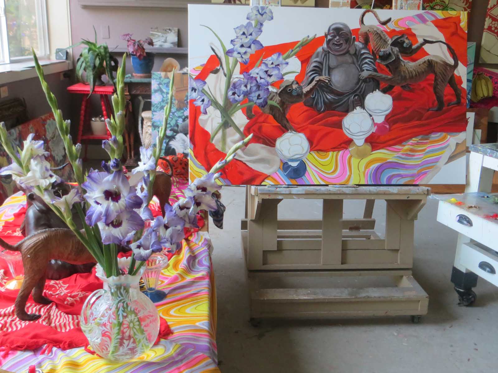 If I were the type to want a headstone over my grave, it would surely read: Gladiolas are a BITCH! Nevertheless, when I saw these at the grocery store, I knew they absolutely belonged in this painting. Maybe today I’ll add the ice cream..?