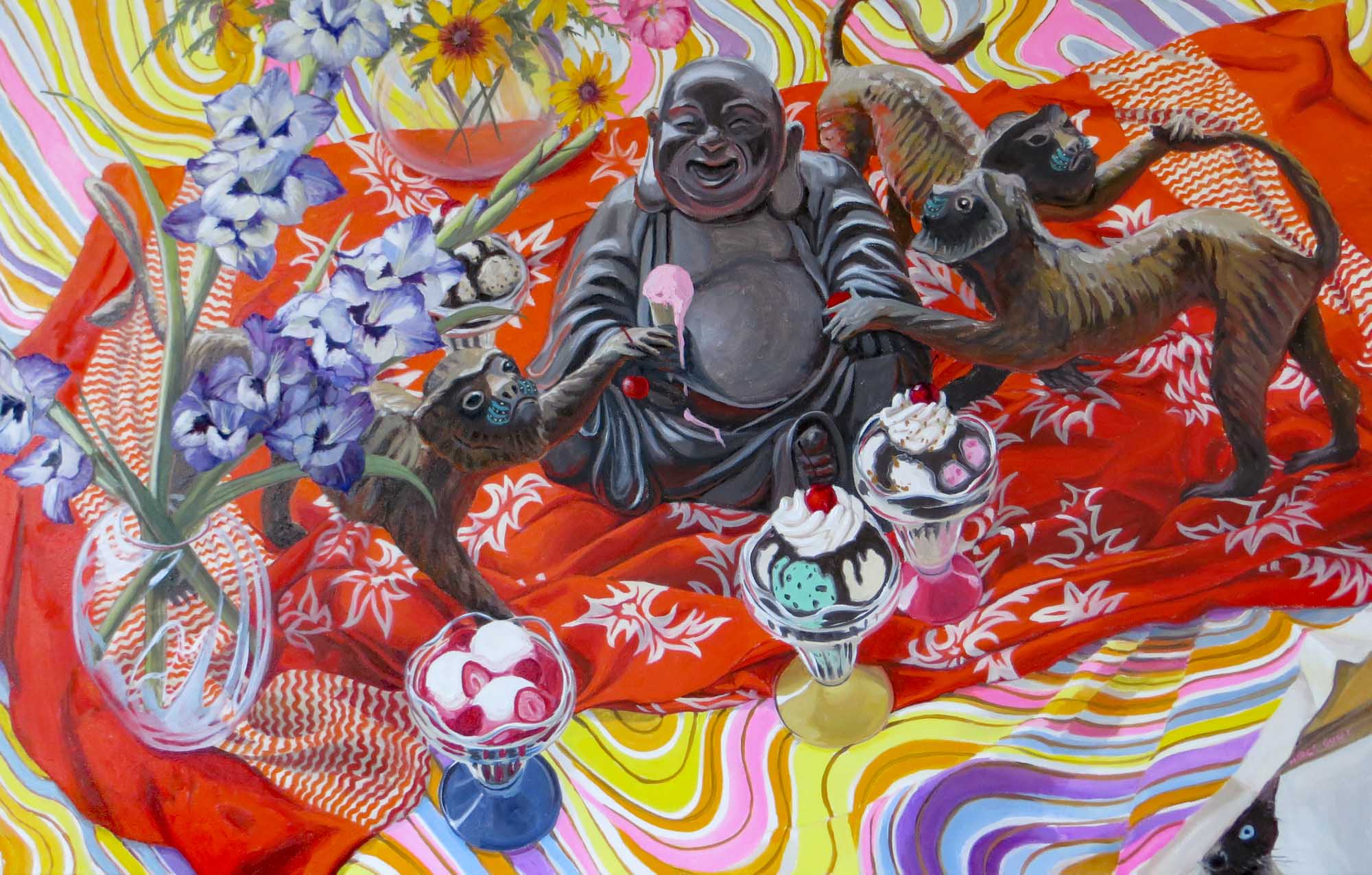 Torrential rains yesterday eliminated all temptations to do yardwork, so I managed to finish this. I desperately needed something wild, crazy & colorful to take my mind off politics. The gladiolas were a bitch as usual; the ice cream was totally invented. Those are antique leather monkeys from Dead People’s Stuff over in Northport. And that’s my dear, little Bernie Sanders, a Siamese from Craig’s List. Hates all cat food; lives on mice.