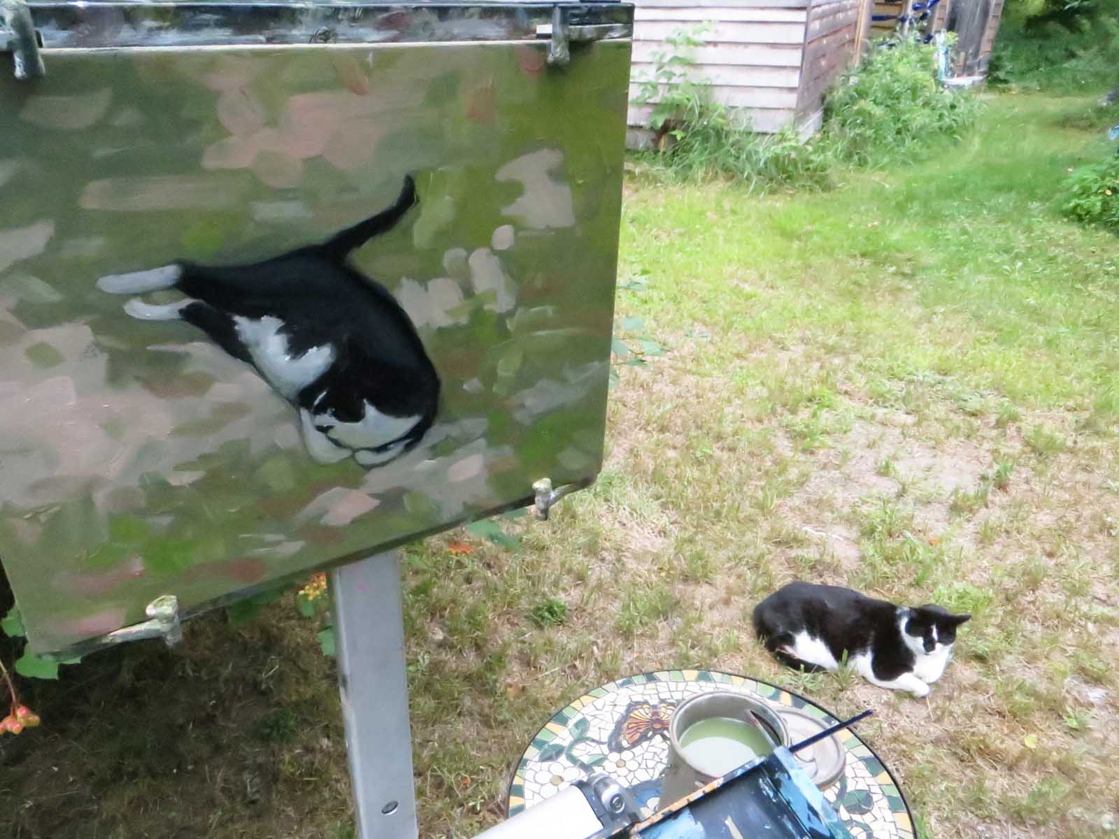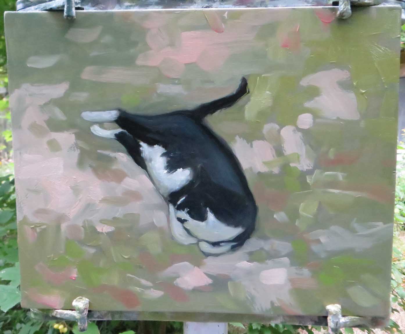 Just try to get a cat to hold still for 5 minutes! I’d set up my easel in back of the studio, overlooking the swamp. I’d meant to paint a view of a button bush, but decided it wasn’t going well — and wiped it out. Meanwhile, Picasso had moseyed around to see what his momcat was up to. Why not paint him? So adorable! OY! He’d roll around and stretch just about every minute or two. So it was a bit interesting, but kind of fun to try anyway.