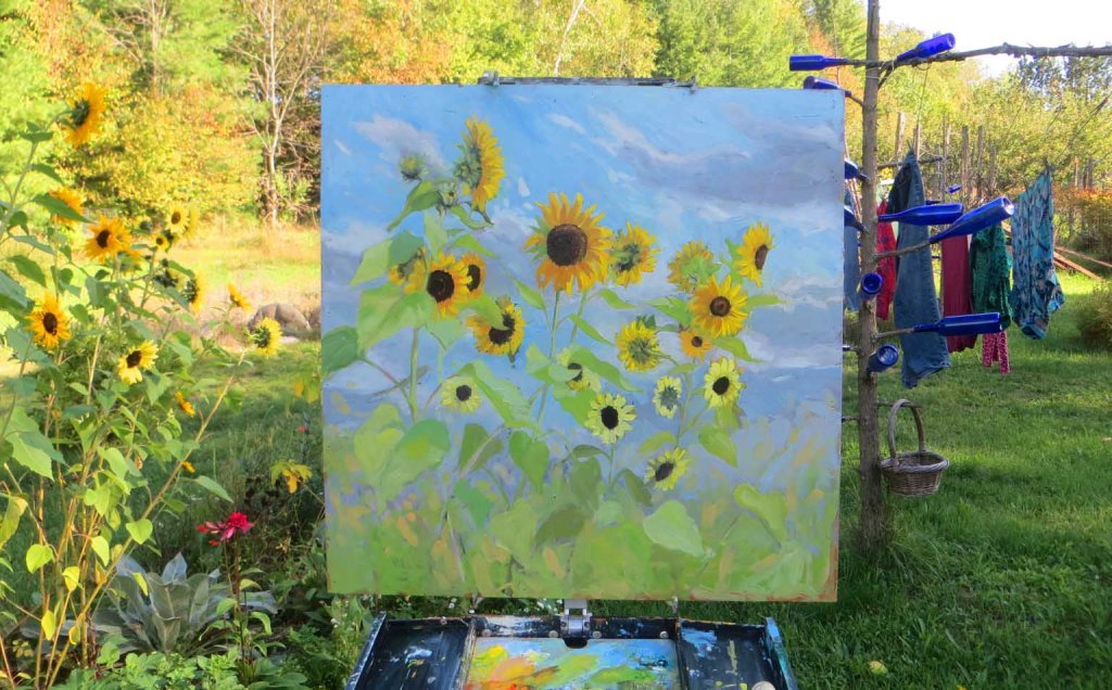 I’d been eyeing this little grove of sunflowers for a few days, wondering if I’d have the nerve to try painting it. They’re blooming to perfection. That’s a miracle, considering the ravenous deer population around here. I go through a lot of Liquid Fence. Today was stupendously gorgeous – with big, puffy clouds gliding past. I grabbed an old (and unsatisfying!) painting, scraped and sanded it down, then set up my Soltek in the yard to give it a go. It was pretty confusing, painting over the old painting, but I did what I could. This was about as far as I could go with this today. Everything’s super-gooey. I’ll come back to it in a couple days to see if I can whip it into shape. Wait ’til you see the frame I have for it! And yes, that’s my laundry line on the right.
