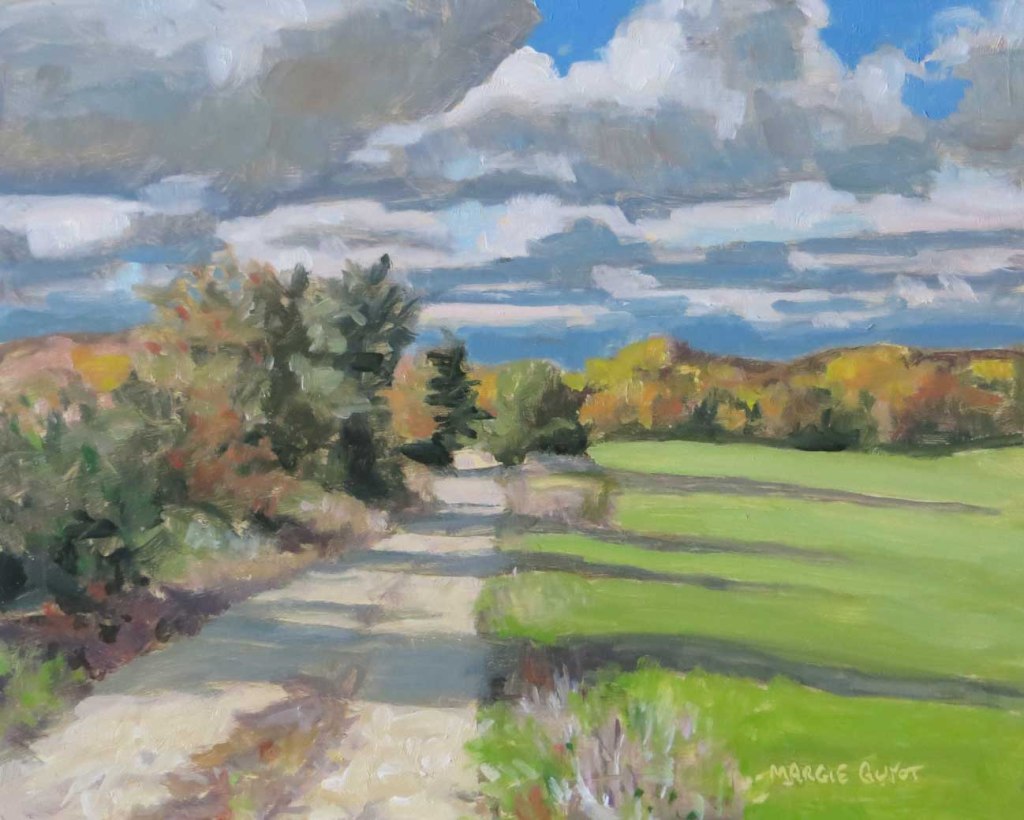 South Peebles Road is another favorite road of mine. Mostly it’s a seasonal road, impossible to drive on in winter. Nobody plows it. It winds through apple orchards and thick maple woods, coming out onto an area of open farm fields. Just beyond this spot, down the hill is another favorite road: Toad Lake Road. And yes, there is a Toad Lake. I’ve been meaning to take my kayak out on it. Maybe next spring. Behind where I stood to paint this is a wild apple tree, right at the bend of the road. I stopped to do a taste-test. Actually quite a good apple!