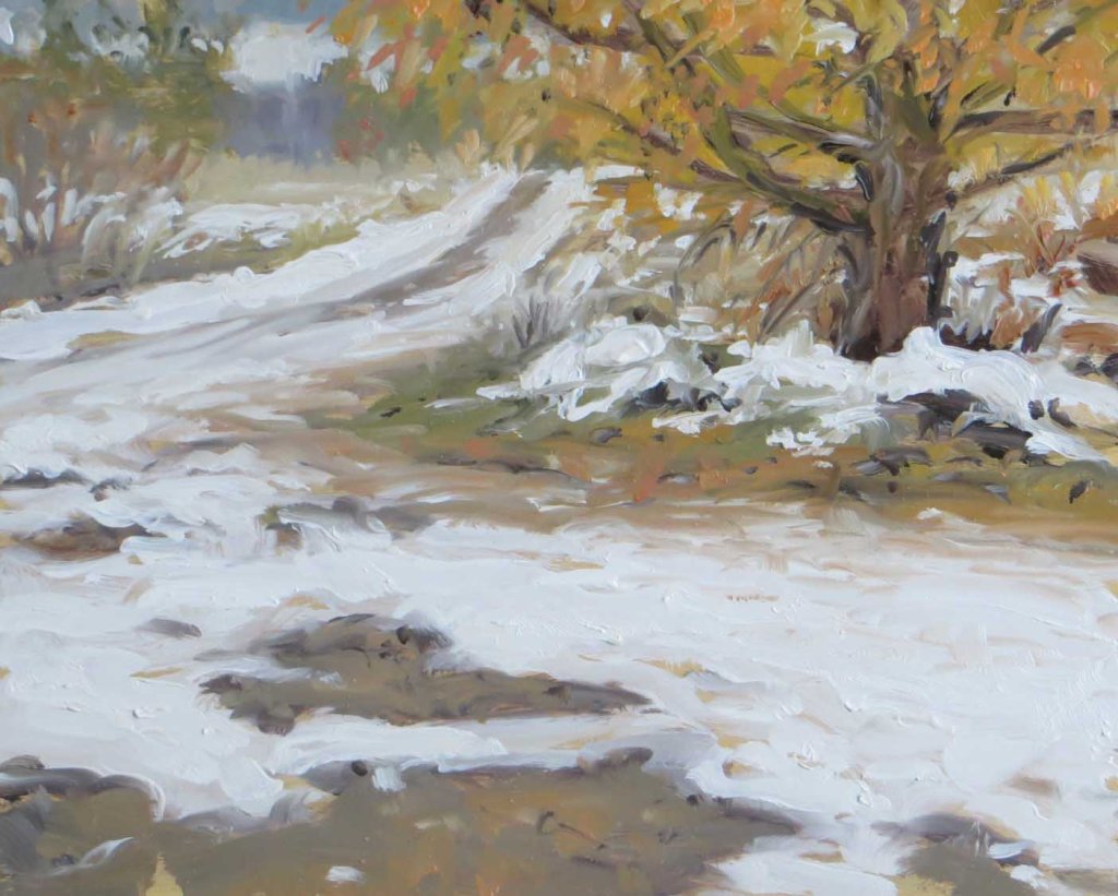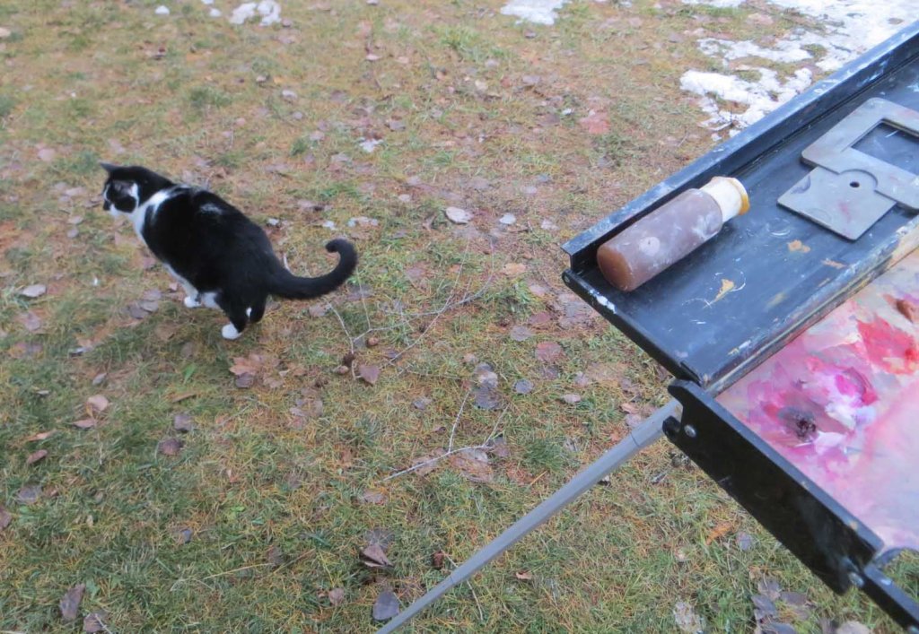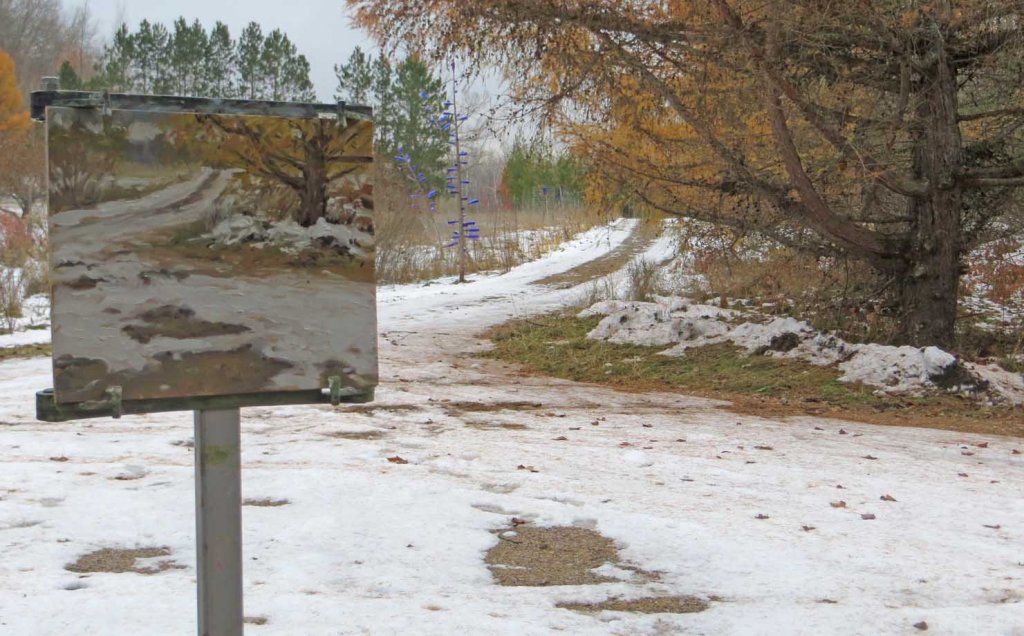 Yesterday I finished painting “Christmas Cats” in the studio around 3 PM. I love to celebrate finishing a painting by doing something exhausting, like pulling weeds or shoveling snow. But the snow’s already been shoveled. And phooey on the weeds! I parked my easel just outside the studio building and painted this view of my driveway. The row of European larches have turned a deep caramel color. Their needles will drop in a week or so and everything will turn shades of blah-monochromatic until about next April.
