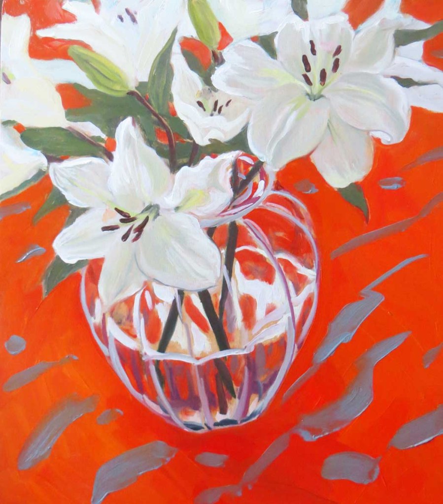 It was a great day to hole up in a nice, cozy studio and paint lilies! These still looked fairly acceptable, so I thought it’d be fun to crank out another lily painting. And who couldn’t use more “screaming orange” on their walls?
