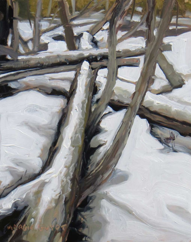 I was in a mood to paint something today — but what? I didn’t feel like driving anywhere. The sky was overcast and the snow was melting. I wandered around the yard, knowing I’d find something interesting. Sure ’nuff — this is right in back of my studio. My toes froze but it was worth it!