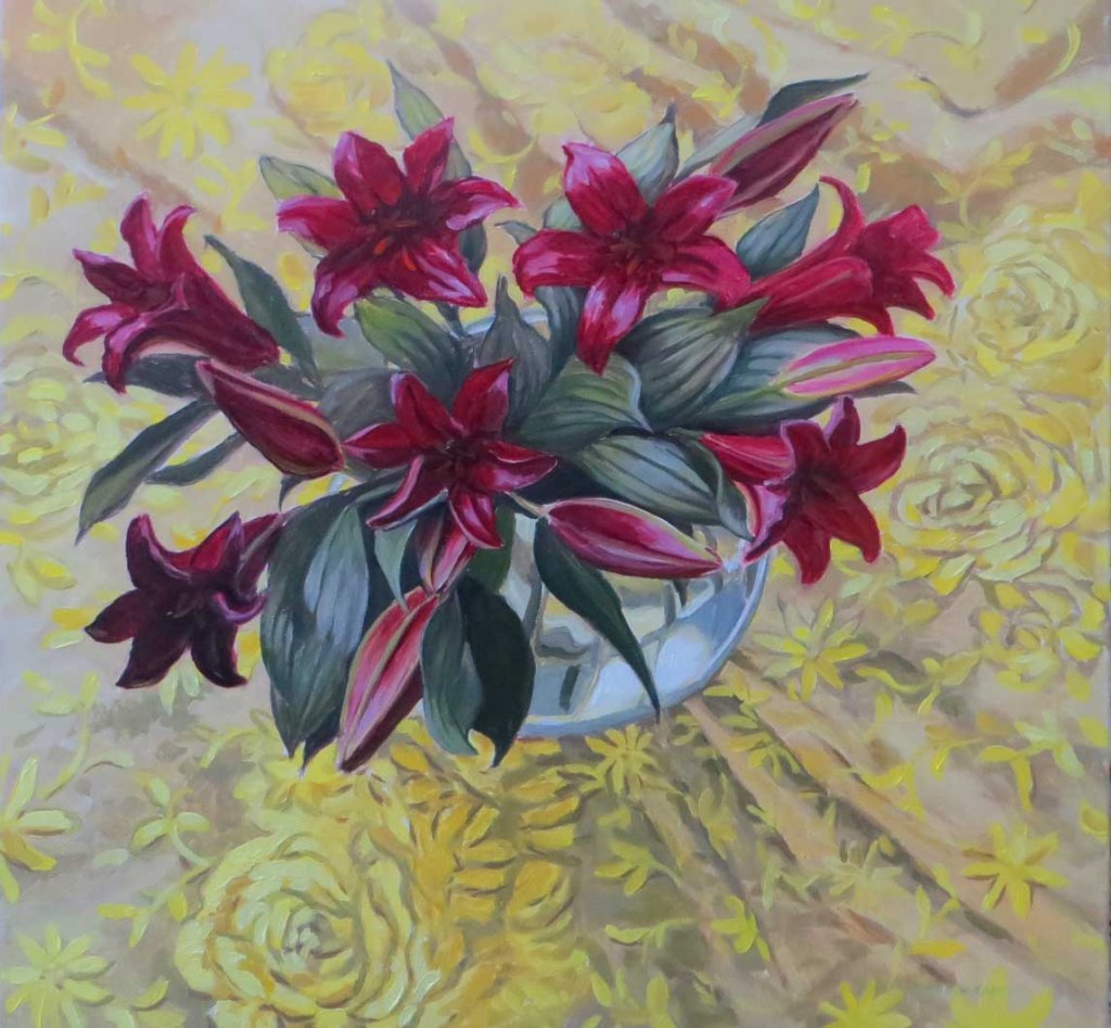 I thought these were Asiatic lilies when I found them in the grocery store a few days ago. But they’re Orientals — and the smell is wonderful! My studio hasn’t smelled this good in a long time. I paired them up with an antique silk shawl with gold embroidery. And for once I didn’t have bright sunlight come flooding onto my setup! That’s what’s hard — starting a painting with one type of light (up here, it’s gloomy all winter) and then getting hit with bright sunlight the next day. Colors and shadows become totally different. No, the weather cooperated this time. Blowing snow here at the moment. Consistency is good!