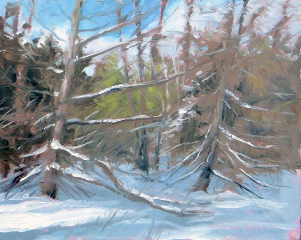 A friend said she’d come by today — but wasn’t sure what time. So I hung around. The sun came out and I was itching to go out painting. So I did the next best thing: a painting in my driveway. I was using a panel toned in a very bright pinkish-lavender and struggled with that. Everything looked very green. But I think eventually it turned out OK.