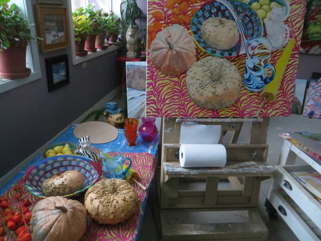 It was a good day to hole up in a nice, warm studio and pretty up the warts on the pumpkins. I added some Japanese (or is it Chinese?) lanterns up in the left corner and got the deep pink stripes going, listening to Keb’ Mo’ on the stereo. A good day overall….