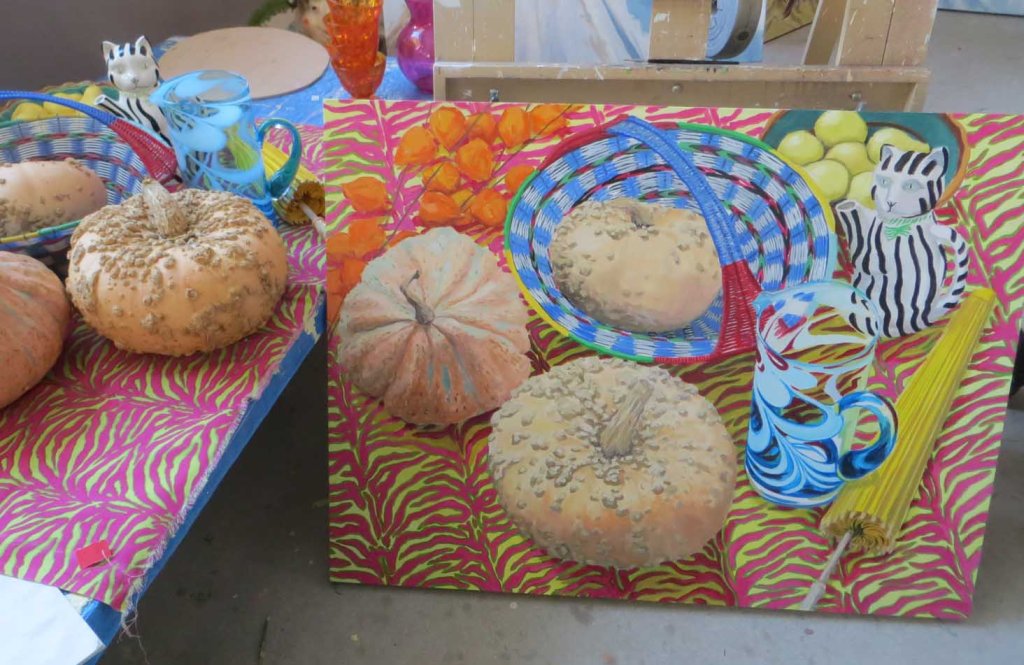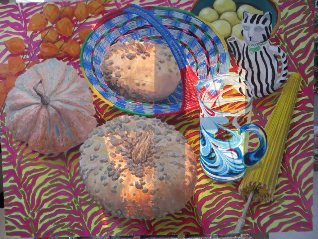 Bright sunlight put a halt to painting today, shining through the back of my canvas about 4 PM. As if this one isn’t difficult enough! But it was a good day. Listened to Keb’ Mo’. Had raw kale salad for lunch. Supervised by adoring cats. Progress! I had to set this one on the floor to get a halfway decent photo.