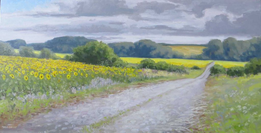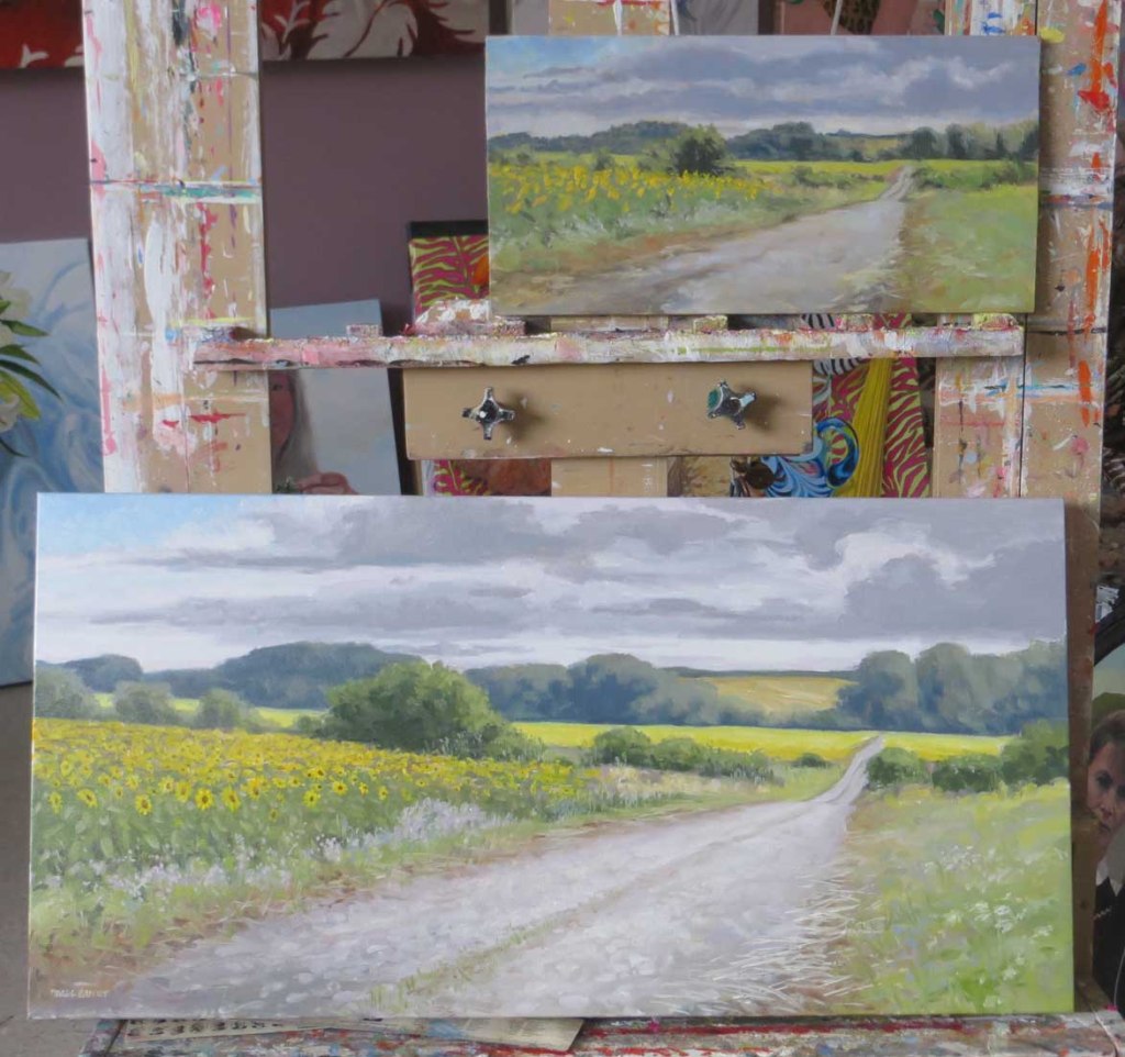 There’s a beautiful sunflower field just north of Traverse City that artists and photographers flock to every summer. I did a small plein air field study (see above) one morning. Today I decided to be brave (!) and try to do a larger painting, using my study as a reference.