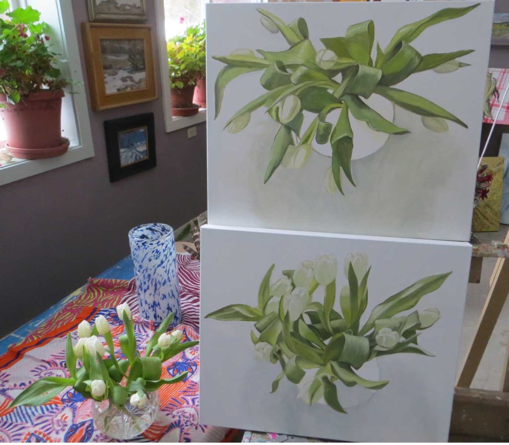 The tulips perked up today (see bottom painting) so I decided to crank out a second painting. The painting on top is the one I did yesterday, when all the blooms were hiding. I’ll paint in the backgrounds later. What will tomorrow bring? New twists & turns, maybe….