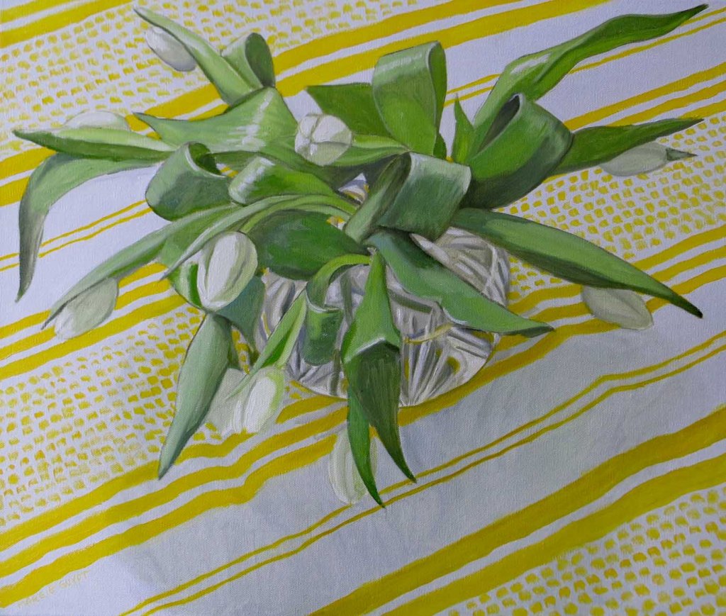 White Tulips on a Yellow Cloth 0 January 26, 2020 Written by margiethepainter “White Tulips on a Yellow Cloth” — oil on canvas 20 x 24″ by Margie Guyot It’s cold. Snow’s blowing. A great day to stay inside and paint tulips! Hurry, Spring! Share this: Share on X (Opens in new window) X Share on Facebook (Opens in new window) Facebook Like Loading... Related