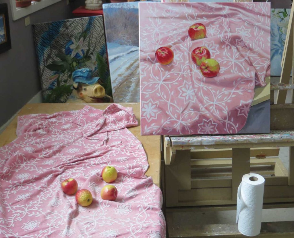 Didn’t have time to touch this yesterday. ‘Twas another day of schlepping hither and yon to Traverse City (a.k.a. “the Paris of the North”). Probably just as well. The background had to dry before I could start pecking away on the design. OY! Maybe tomorrow I can finish this thang. Oh — and the apples have all be rearranged, thanks to the cats that enjoyed snoozing in the middle of my setup.