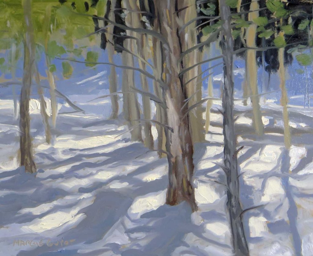 As I was finishing up this still life in the studio, the sun made a surprising appearance. After weeks of winter gloom and clouds, when the sun finally peeks out, it’s almost annoying. I perked up with a cup of hi-test coffee and went out plein air painting.