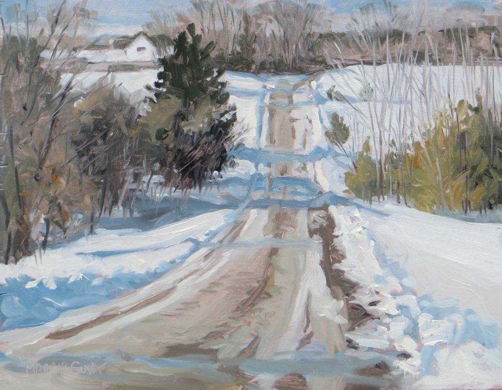It always happens: the sun comes out and teases me. I gather up my painting gear and drive around to find a “magic spot”. Within about half an hour, the sun up and leaves, never to return. Good thing I’ve learned to nail the shadow patterns ASAP. I love this road. It’s only about 1 block long. Right off Church Road, south of Essex Road. Some interesting spots to paint right in this area. Old barns, orchards, cows, a farm with dozens of black cats. The fun never ends!