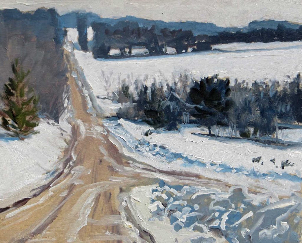 I had the brilliant foresight to throw my paints into the truck before heading out this afternoon. I had to drop off 10 little paintings at the Jordan River Arts Council in East Jordan. Heading north from there along the lake, I zig-zagged over to the corner of Ranney Road where it meets Metz Road. I’ve always thought this was such a pretty spot and have tried painting it more than once. Today’s effort was the first time I actually liked how it turned out. Notice the little house tucked into the trees on the lower right? And what you’re seeing is the good part of the road! Thank goodness for 4WD!