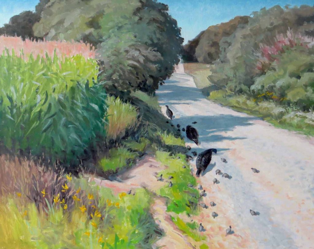 When it translated out to the large painting, I thought things looked a little bare. It needed something. A turtle crossing the road? A pair of fleshy nymphs being chased by a satry? As soon as I walked into the studio yesterday morning I knew it had to be turkeys.