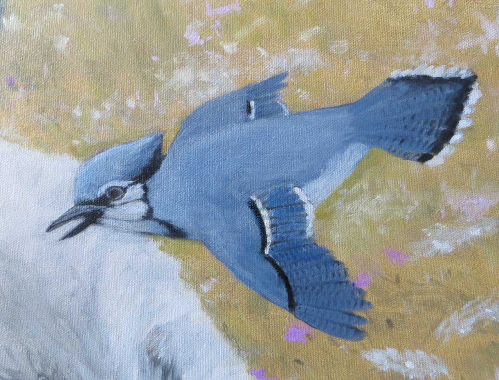 Why not add a bluejay? I thought. The first bluejay looked like a Disney cartoon bird! Wiped it out. Struggled to find a good photo of a bluejay to work from. I painted this over several times. Note to self: next time one of the cats catches a bird, confiscate it and paint a couple studies!