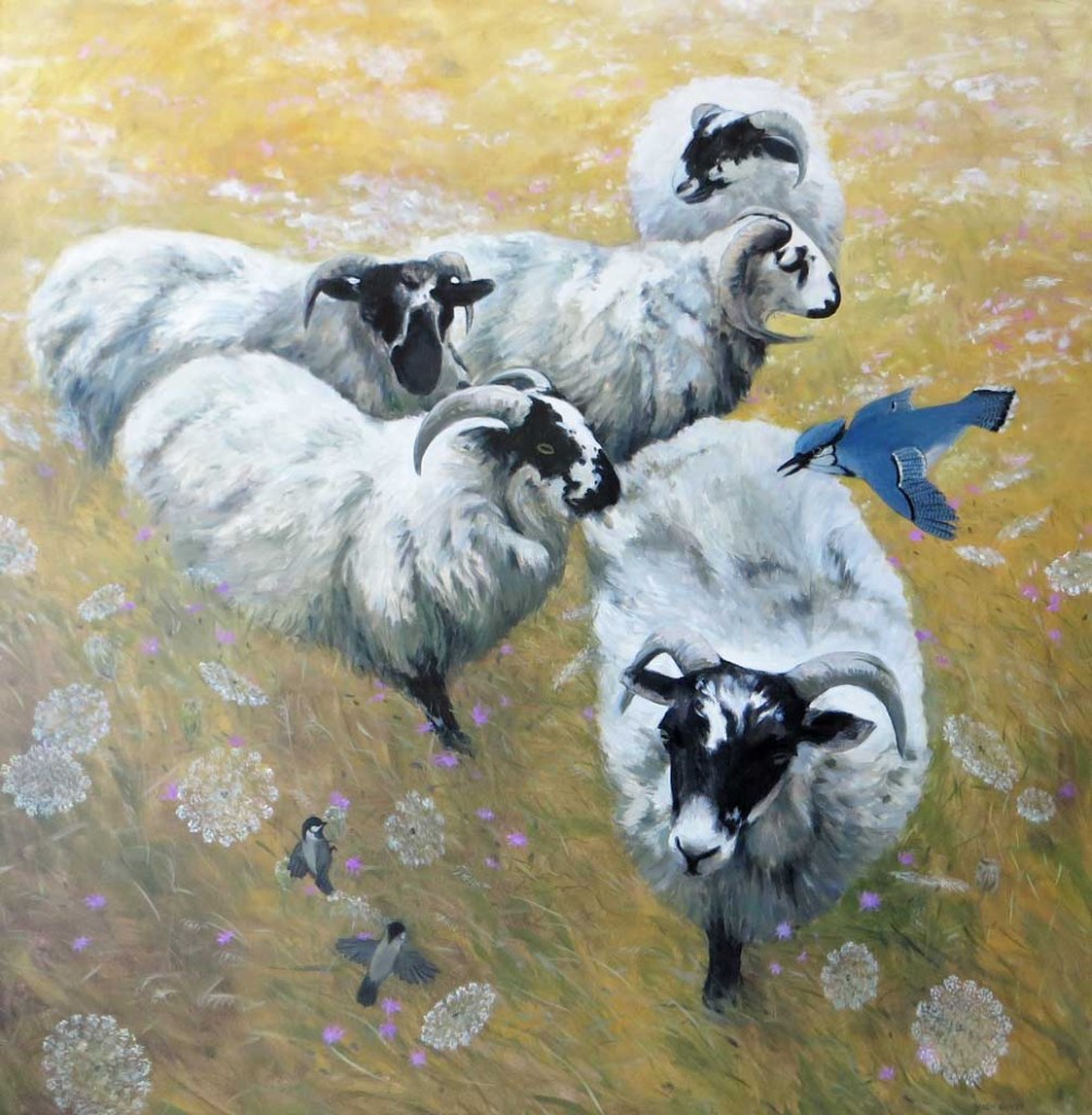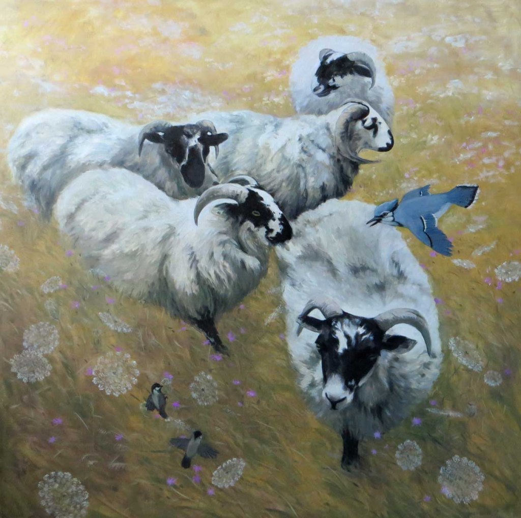 Next day I came back, bound and determined to put a sheep up there. A proper sheep, though, just the right size, right place, looking the right way. Rifled through my photographs of Rusty’s sheep. All were facing right. Alas — I needed one looking to the left “for the flow of the composition”. Don’t ask how I know these things — I was a music major. What I ended up doing was holding the photograph of the sheep up to the light, viewing it from the backside of the paper to see the angle I wanted. From there it was just an easy matter of “putzing with the flowers”. I think it’s done. Probably….