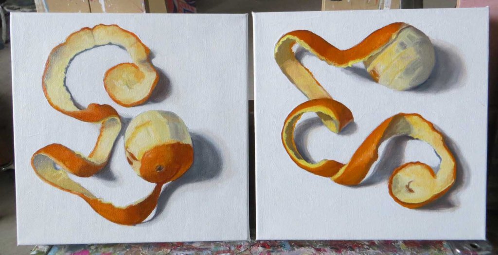 Since we’ve been ordered to “shelter in place” during this Corona Virus quarantine, I’ve become fascinated by peeled oranges. Until you’ve tried painting them, you just wouldn’t know how much fun they can be! In a way they kind of look like viruses. I painted these two images today, using the same orange, just re-arranged slightly different. The possibilities are endless! Although I only have two more 10×10″ canvases. Boo-hoo! Hmmmm….. Should I order more?