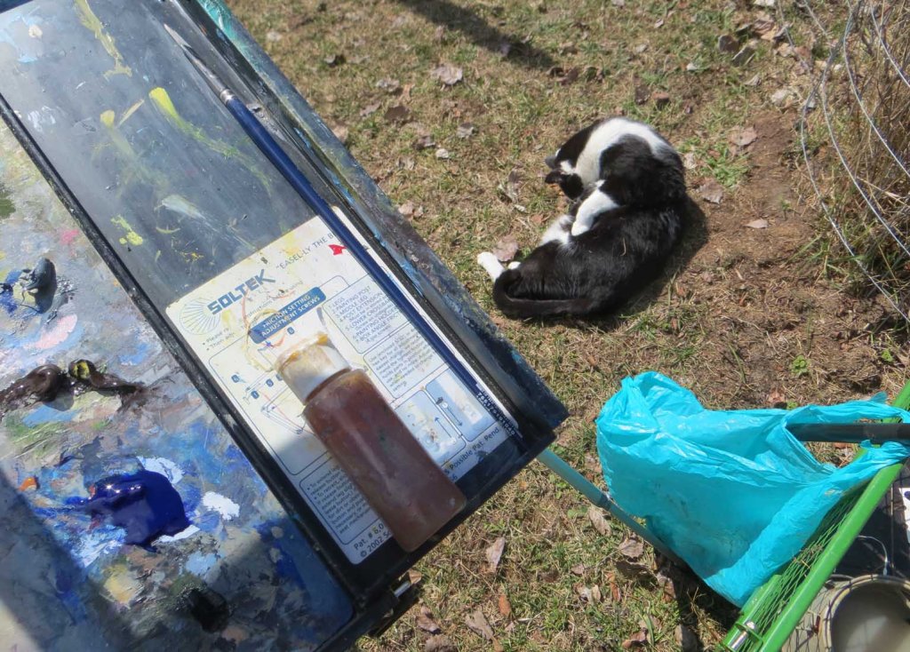 Yes, that’s my devoted cat, Picasso. He follows me everywhere and hangs by my side the whole time I’m painting. He’s giving himself a bath. Cleaning up so he can go roll in the dirt again.