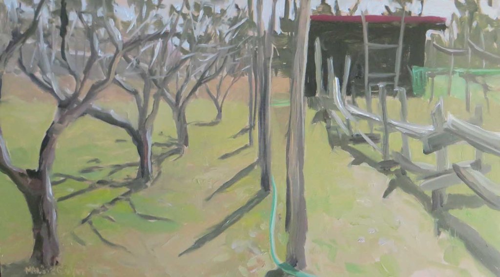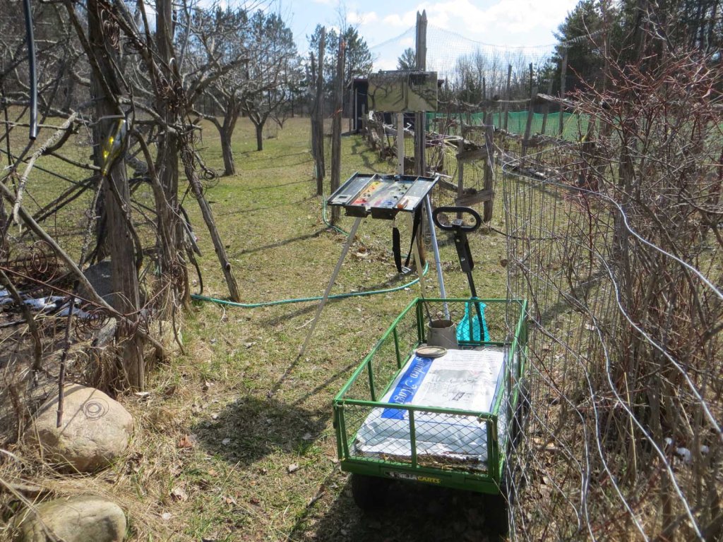A gorgeous-but-chilly day, I had a hankering to go plein air painting. But I decided to “shelter in place” right at home. This is the view of my orchard and berry patch, looking out to my little potting shed. I decided to toss my gear into my wagon (why suffer needlessly?). And yes, that’s a bag of Michigan peat in there. Why lift 40 pounds if you don’t need to?
