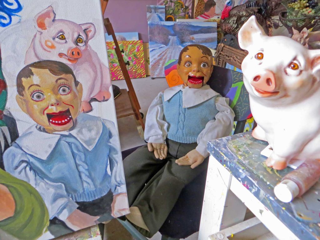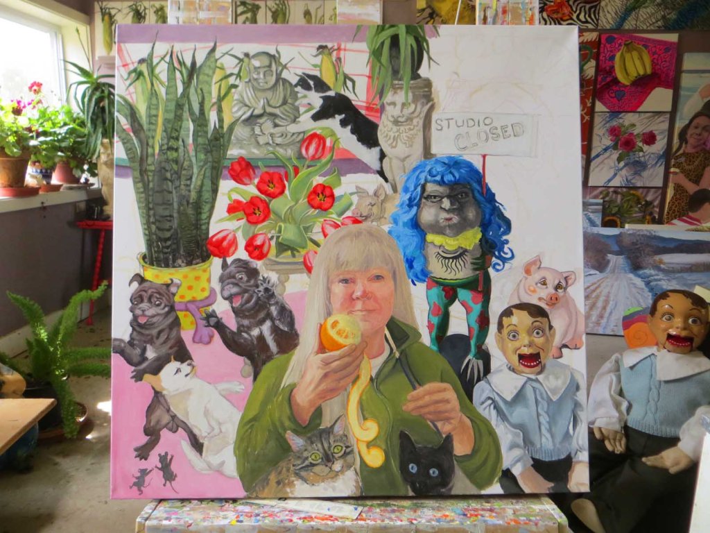 The sun is such a tease today, hiding behind high, thin clouds. I’ve been in the studio for the past 4 or 5 hours and have had enough! The urge to go out and putter in the garden has won out. Day 5 on this one and I’ve added Picasso in the back, sniffing the Buddha. The pig is a lucky find from a junk store. Normally he (she?) sits on the buffet next to my front door, giving me a sympathetic smile as I venture forth into the cruel world. Don’t we all need a sympathetic smile, if even just from a pig?