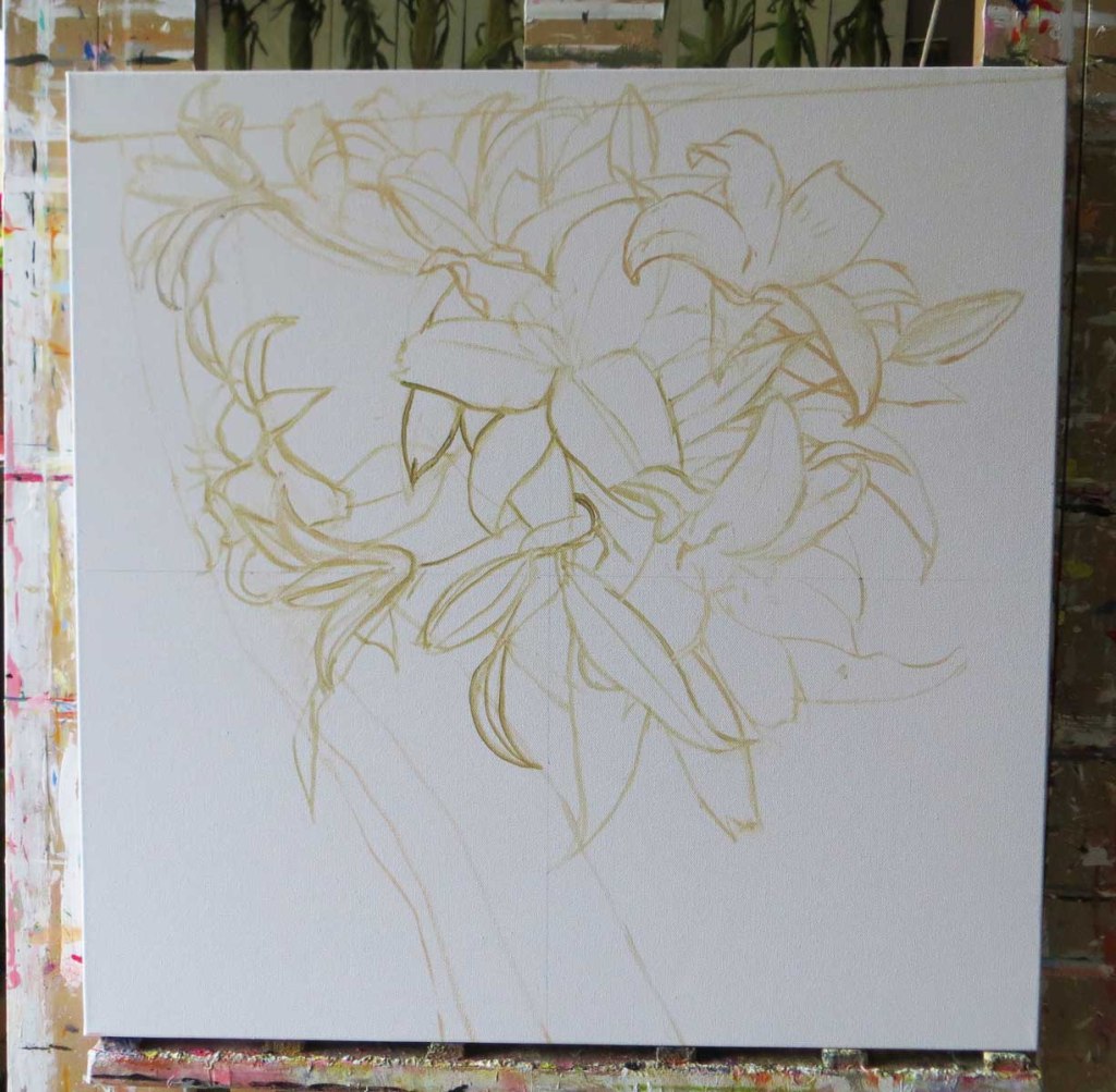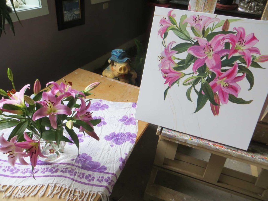 I’d bought these oriental lilies several days ago and they were opening up quite nicely. Today I decided to knuckle down at paint them before they rotted. Very rainy today (and tomorrow, they say), so I decided to put nose-to-the-grindstone.