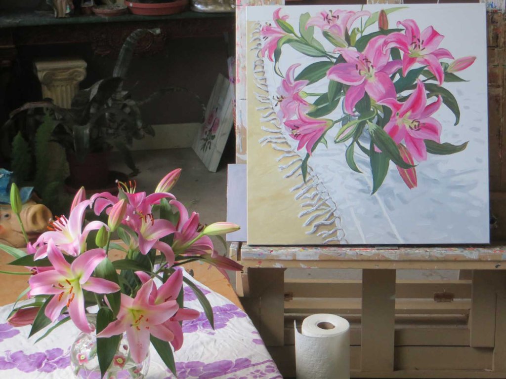 Today I painted in the table and fringed shawl. If it’s dry enough tomorrow I’ll paint in the lavender flowers and call it done. Gardening season hits and painting will take a back seat.