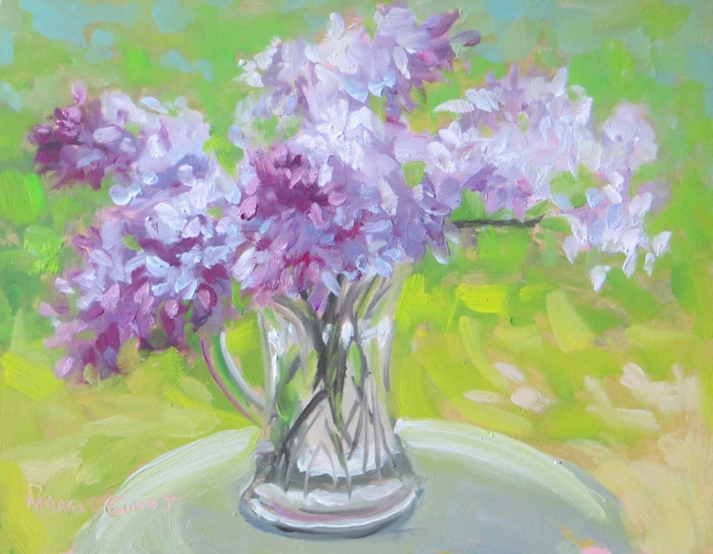 This is prime gardening season and painting has had to wait. Around 4:00 today I plopped a vase of lilacs onto the patio table and decided I’d better paint as fast as I could. Rain is on the way and lilacs could be kaput in a day or so. My dear cat, Picasso, kept me company the whole time.