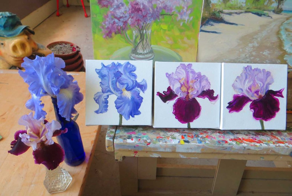 Ah, another hot one here. Glad to have a cool studio to sit and paint in. No ladders today for me, but I still ran hither and thither about, weeding, moving the sprinkler and supervising my mini-construction crew. Three more blank canvases left….